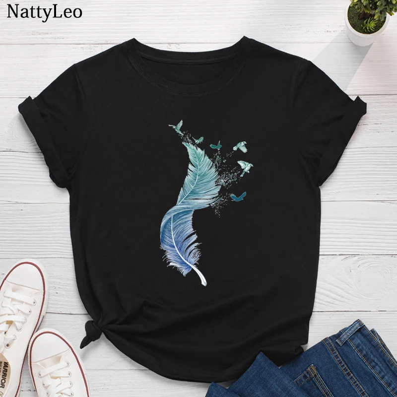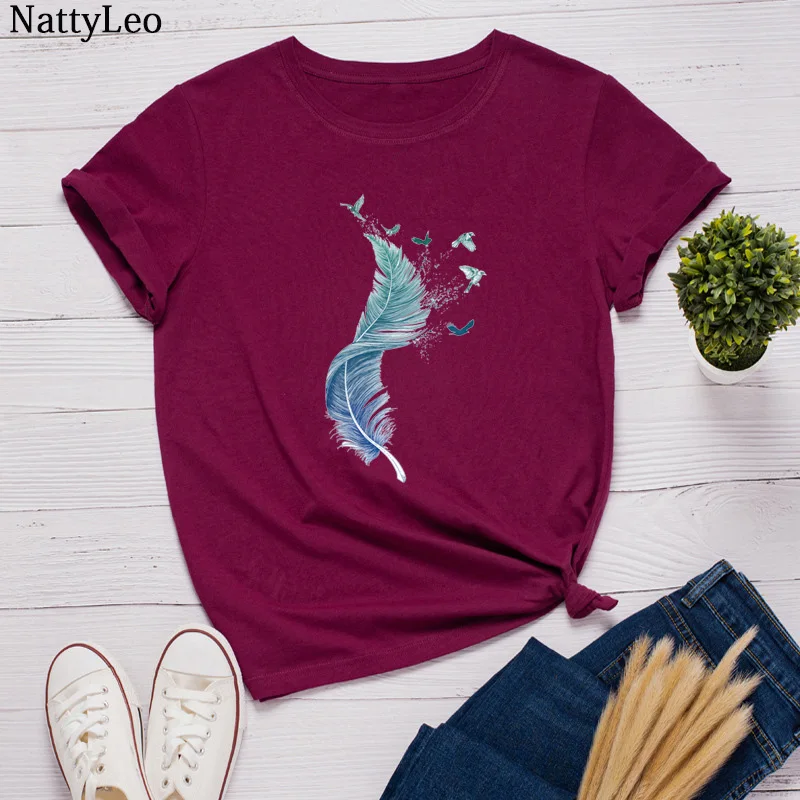 Футболка женская в стиле оверсайз с круглым вырезом, модный топ с принтом перьев, короткий рукав, S-5XL хлопок, розовый топ, размера плюс
