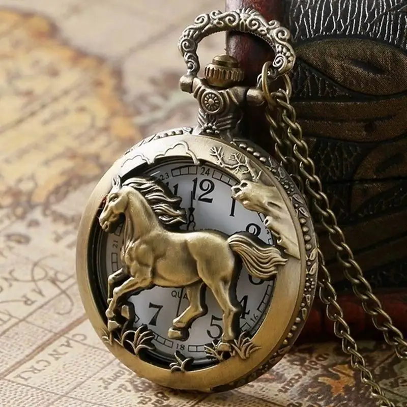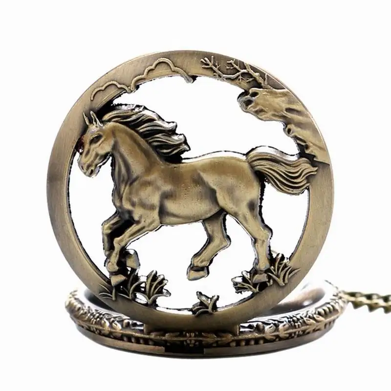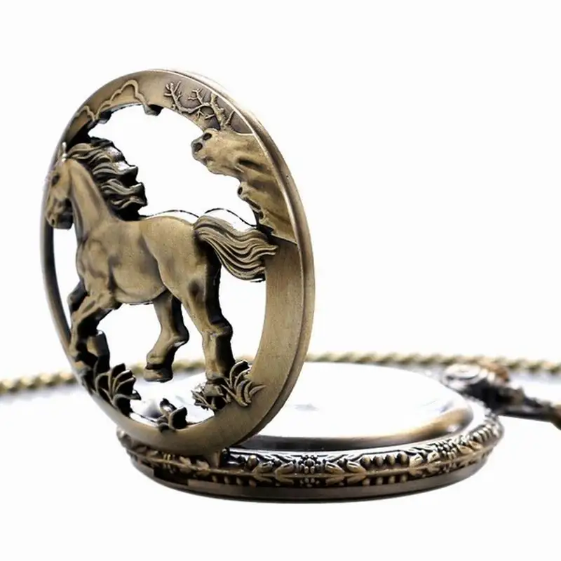 Винтажные карманные часы с бронзовым отверстием и лошадью, уникальные подарки унисекс, рельефный откидной Чехол с подвеской, карманные часы с цепочкой, ожерелье
