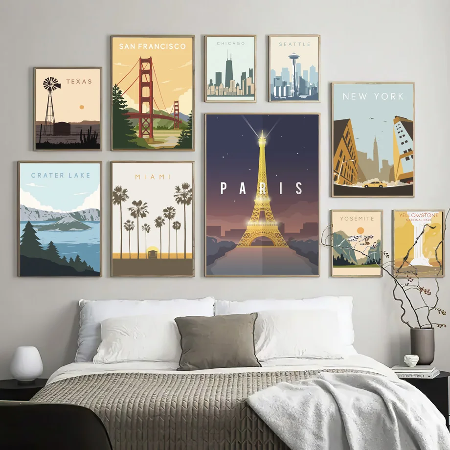 Настенные картины с изображением башни Парижа, берега Амальфи, чайк...