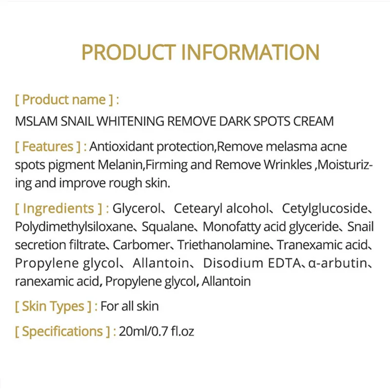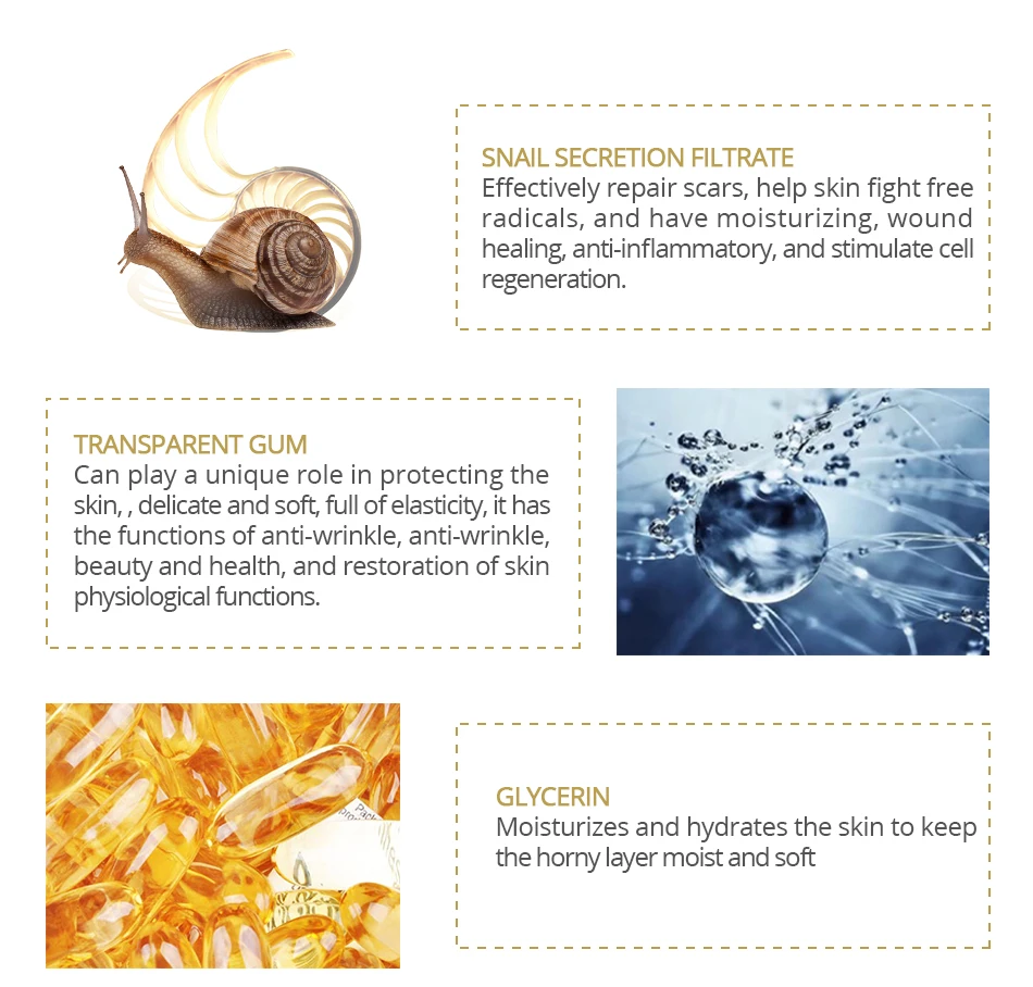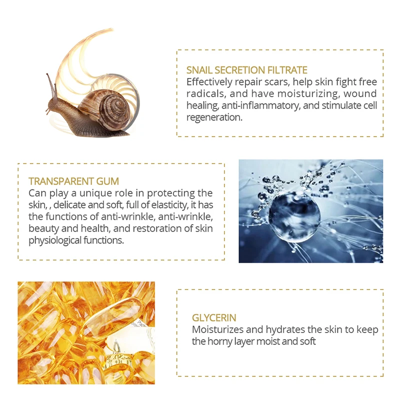 Эффективно восстанавливает шрамы, помогает коже избавиться от радикалов и увлажняет, заживляет рану, инфиамативный и стимулирует регенерацию клеток.Прозрачная резинкаМожет играть уникальную роль в защите кожи, нежной и мягкой, полной эластичности, имеет функции против морщин, против морщин, eauty и здоровья, а также восстановление phvsiological функций кожи.ГлицеринУвлажняет и увлажняет кожу, чтобы сохранить роговой слой влажным и мягкимБетаинУлучшает иммунитет, способствует метаболизму жира, способствует метаболизму белка и эластичности кожи.Экстракт улитки и эффективный увлажняющий фактор instantlv проникают в нижнюю часть кожи, всесторонне регулируя нижнюю часть клеток кожи, успокаивая сухие мышцы, грубый ремонт, укрепляя нежную кожу. Помогая коже достичь самостоятельного ремонта, восстановите увлажнение. Плотная гладкая кожа.