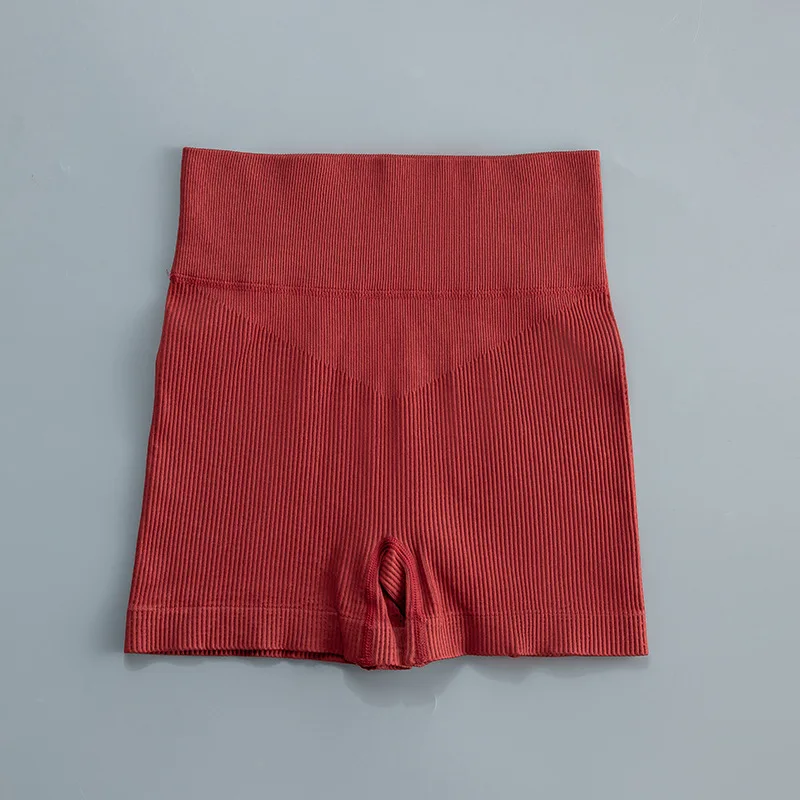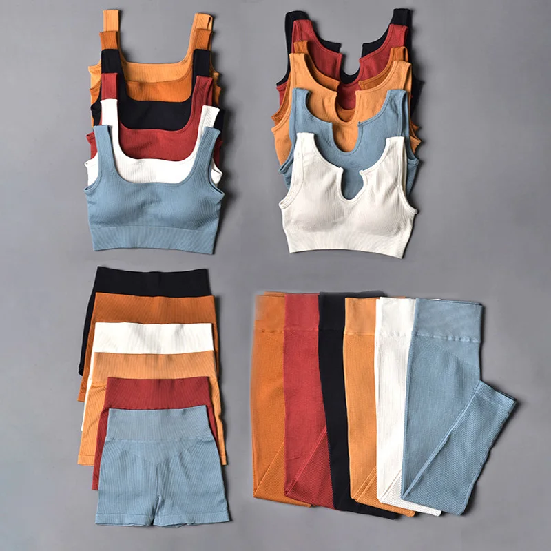 Бесшовный Женский комплект для йоги, тренировочная спортивная одежда, одежда для спортзала, однотонные ребристые спортивные шорты для фитнеса, леггинсы с высокой талией, спортивный костюм