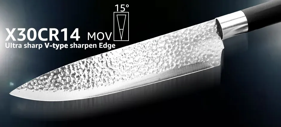 1. Материал лезвия: 5CR15MOV высокоуглеродистая Нержавеющая сталь2. Твердость лезвия: 56- 58 HRC3. Поверхность лезвия: ручная работа4. Материал ручки: Высококачественная Нескользящая ручка ABS + мягкое покрытие TPR* Примечание: Каждый нож имеет защитную пластиковую крышку ножа *