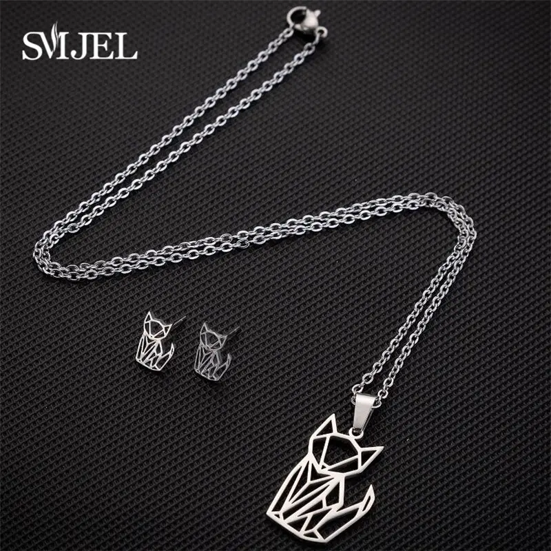 Женские Ювелирные наборы в форме кошки, из нержавеющей стали, серьги милое животное, кошка, ожерелья и колье в форме оригами, золотого цвета, подвеска в виде следа