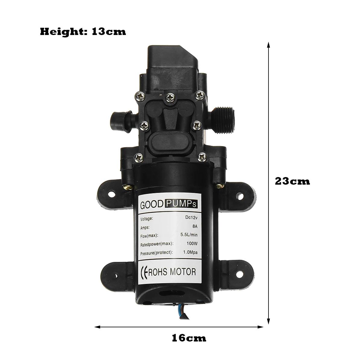 Спецификация:Название продукта: 12V 1Mpa высокое Давление диафрагмы Самовсасывающие Водяной насос 5.5L/мин 100WМатериал: АБС-пластик + металлВес: approx.1300gРазмер: 16*13*23 см/6,3*5,1*9,1 дюймовПрикуриватель: 300 см/118,1 дюймаВыпускная труба: 600 см/236,2 дюймаЦвет: черныйНапряжение: 12 В (8-14,4 В) постоянного токаТок: 8АПоток: 5 л/минМощность: 100 ВтДавление: 1.0MpaХарактеристики: высокое давление и интеллектуальная защита цепи и регулировка выхода водыОбласть применения: Автомойка, вспенивание, промывание земли, полив цветов
