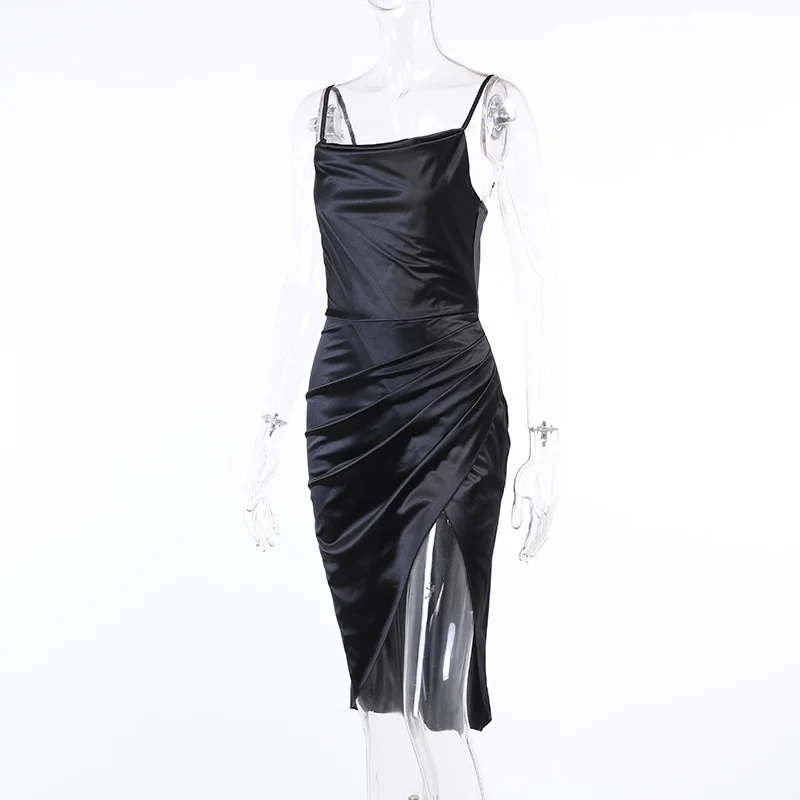 Летнее платье для женщин пикантные Разделение рюши Длинные атласные платье на бретелях без рукавов платье с открытой спиной Элегантные вечерние миди платье Vestidos