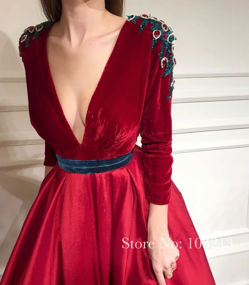 Женское вечернее платье с длинным рукавом, Бордовое платье из тафты с глубоким V-образным вырезом, платье в мусульманском стиле для выпускного вечера, 2020