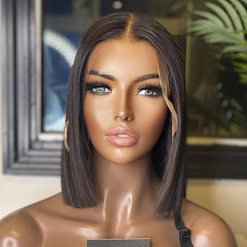 Натуральные черные короткие фронтальные парики боб на сетке для жен...
