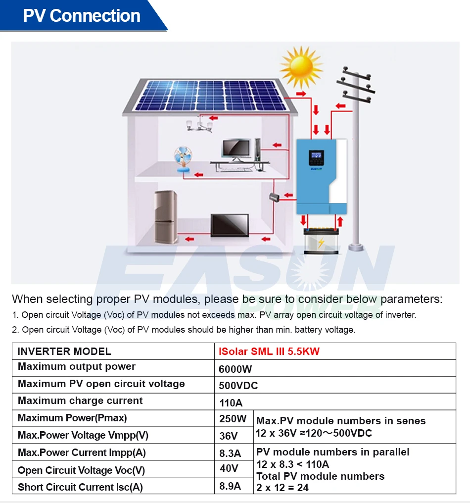 Генерирует энергию от PV непосредственно для подачи нагрузки, даже без батареиЭффективность PV до AC намного вышеПожалуйста, знайте, если инвертор не подключает батарею, напряжение PV должно быть более 200 В постоянного тока.Набор пыли необходимо приобрести дополнительно