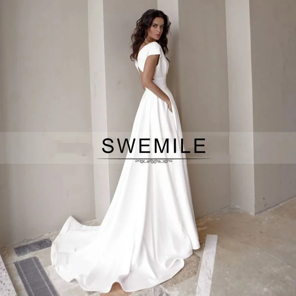 Женское скромное свадебное платье SWEMILE, атласное платье-трапеция со шлейфом, коротким рукавом, V-образным вырезом и карманами
