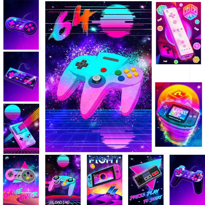 Неоновый геймпад, Картина на холсте, Постер для игр, принты, настен...