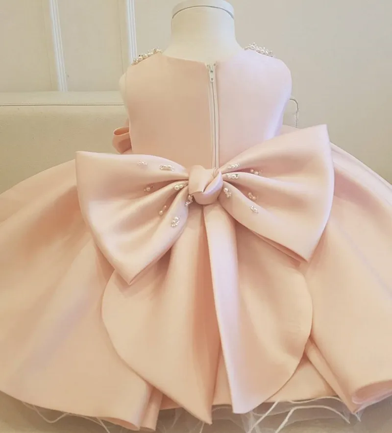 Атласное платье принцессы с бусинами и бантом, белое свадебное платье-пачка, вечернее праздничное платье на день рождения, детское платье для девочек, одежда на 1 год