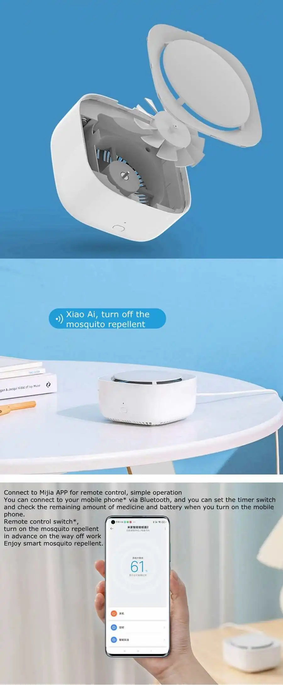 Посылка входит:1 x Новый распылитель комаров XIAOMI1 x коврик от комаров XIAOMI1 x зарядный кабель USB-C1 x Руководство пользователя XIAOMI