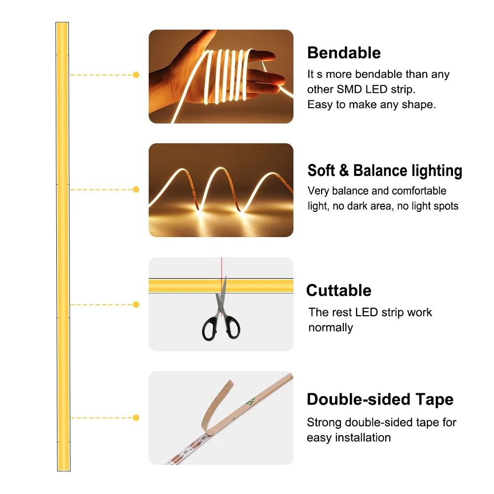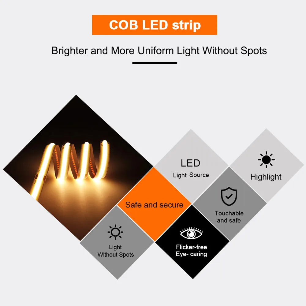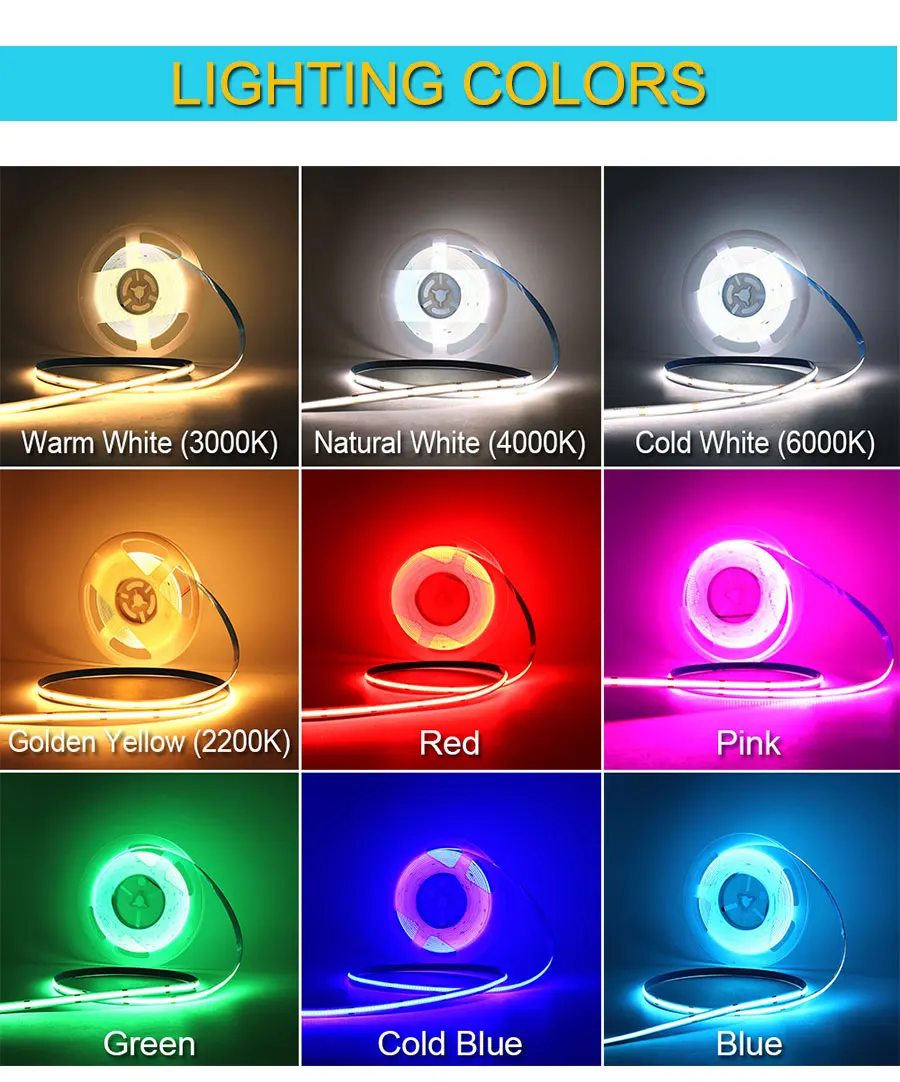 Светодиодный чип: SananДлина: 0,5 м, 1 м, 2 м, 3 м, 4 м, 5 мШирина COB: 8 ммРабочее напряжение: 12 В постоянного тока или 24 В постоянного токаМощность: 10-12 Вт/метрКоличество светодиодов: 384 шт./мРа: >90Класс водонепроницаемости: IP20Световой поток: 110 лм/ВтСветильник: синий, желтый, теплый/холодный белый, красный, холодный синий, золотой, желтый, розовыйПрименение: Внутренняя/уличная декоративная подсветка, автомобильное освещение...