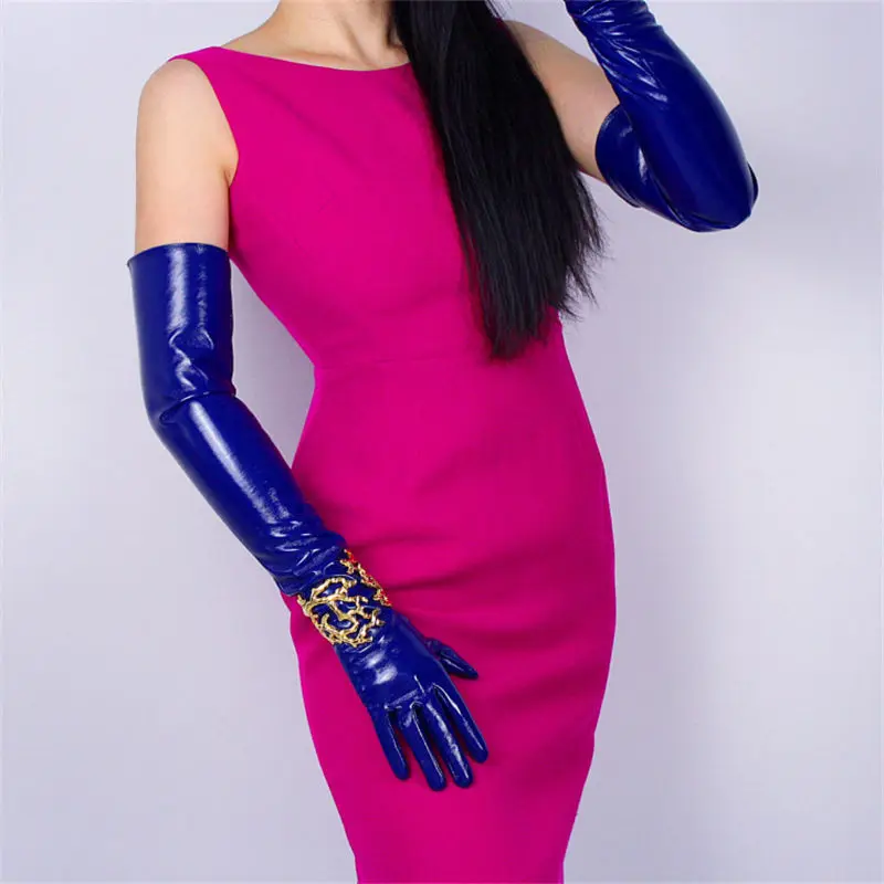 Длинные перчатки из искусственной кожи, зеркальные, темно-синие, 40 см