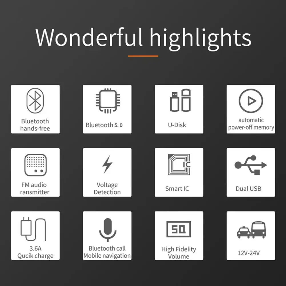 Характеристика:Автоматическое переключение из режима воспроизведения музыки в режим hands-free при ответе на вызовВстроенный микрофонНадежный дизайн с светодиодный дисплеемПоддержка повторного вызоваИнструкции по использованию1. Вставьте штепсельную вилку сигареты в гнездо прикуривателя автомобиля, вставьте mp3, совместим с Bluetooth, а затем включите экран2. Мобильный телефон входит в настройки мобильный телефон, совместим с Bluetooth, подключается к BT28, и голосовые подсказки, что соединение успешно3. Fm-радио-частота такая же, как MP3 Bluetooth-совместима4. Мобильный телефон, музыкальный плеер, может воспроизводить музыку через автомобильный динамикКлавиатура1. Короткая Кнопка паузы/воспроизведения2. При входящем звонке короткое нажатие для ответа на вызов (Длительное нажатие для ответа на вызов); При вызове или маркировке сцены короткое нажатие для поднятия руки; нажмите дважды, чтобы запомнить ваш последний звонок.3 Частота и назначение: Длительное нажатие в течение 3-5 секунд, при освежении экрана, в это время, нажмите трек,/предыдущий пункт, чтобы изменить частоту передачи4. Регулировка громкости: Нажмите и удерживайте в течение 3-5 секунд, когда экран мигает, в это время, нажмите на дорожку/чтобы изменить громкостьСпецификация:Тип: ABS проектТип: Совместим с BluetoothОсобенности: fm-передатчикРазмер продукта: 3,5*3,5*8 см/1,4*3 ''(длина * ширина * высота)Модель продукта: BT28Поддерживаемые файлы: MP3 / WMA / WAV / APE / FLACПоддерживаемая емкость u-диска: класс 10, до 32 гВыход USB: максимум 5 В/3,6 АFM частота: 87,5-108 МГцПосылка включает в себя:1 × Bluetooth-совместимый fm-передатчик