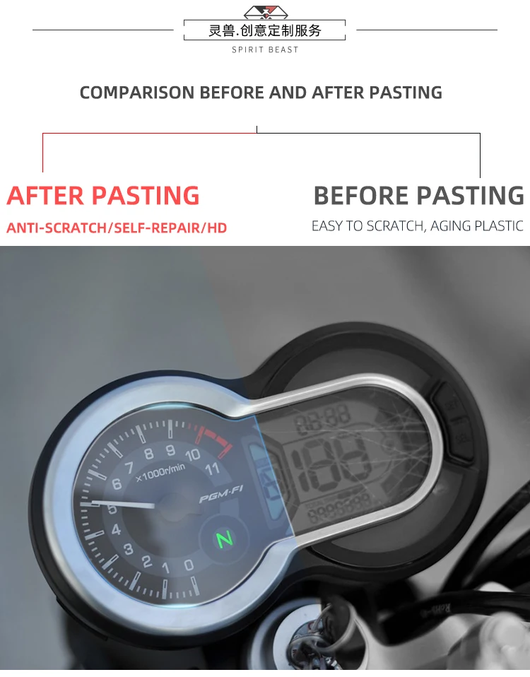 Бренд продукта: SPIRIT BEAST Название продукта: YBM007-instrument пленка L7 Материал изделия: ТПУ Цвет изделия: Прозрачный Функция продукта: высокая четкость, высокая прозрачность, устойчивость к царапинам, защита от тумана и дождя Применимые модели: CB190SS Количество товара: купите один бесплатно Характеристики продукта: защита от дождя и тумана/высокая прозрачность/HD/Защита от царапин/Защита от пыли Теплое напоминание; Отрывайте ① при наклеивании Используйте скребок/карту для удаления пузырьков, затем разорвите ②
