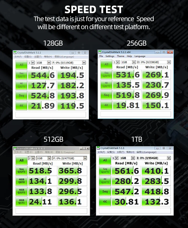 Это первый раз, когда я покупаю хранилище на aliexpress. Получил в течение 10 дней, впечатлен. Протестировано кристаллическим знаком, скорость чтения 450 МБ/с./с, скорость записи 430 МБ/с./с, тестовая среда i5 6500 , 16 ГБ оперативной памяти, последняя версия windows 10, поместите ее в sata в корпус преобразования usb 3,0. Скорость хорошая, 4k гораздо быстрее, чем магнитный привод. P.s) вы можете получить mlc/tlc, обязательно обратитесь к продавцу перед покупкой. Для среднего потребителя, tlc также длится долго. Спасибо.