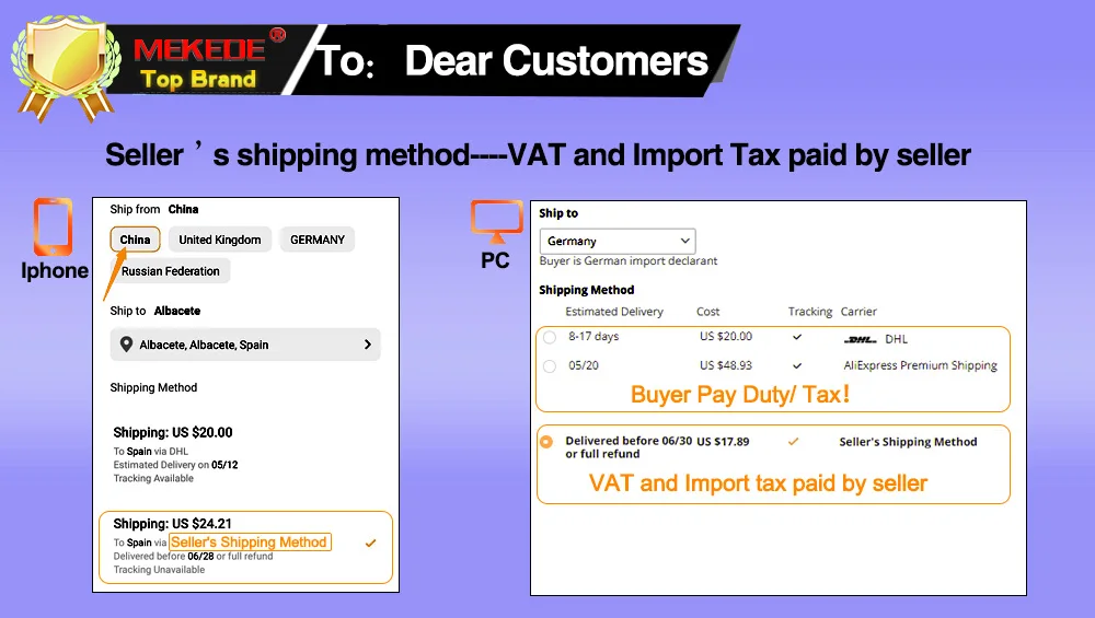 2. Если покупатели из Европы выбирают доставку из Китая (способом доставки продавца), НДС и налог на импорт также оплачиваются продавцом.