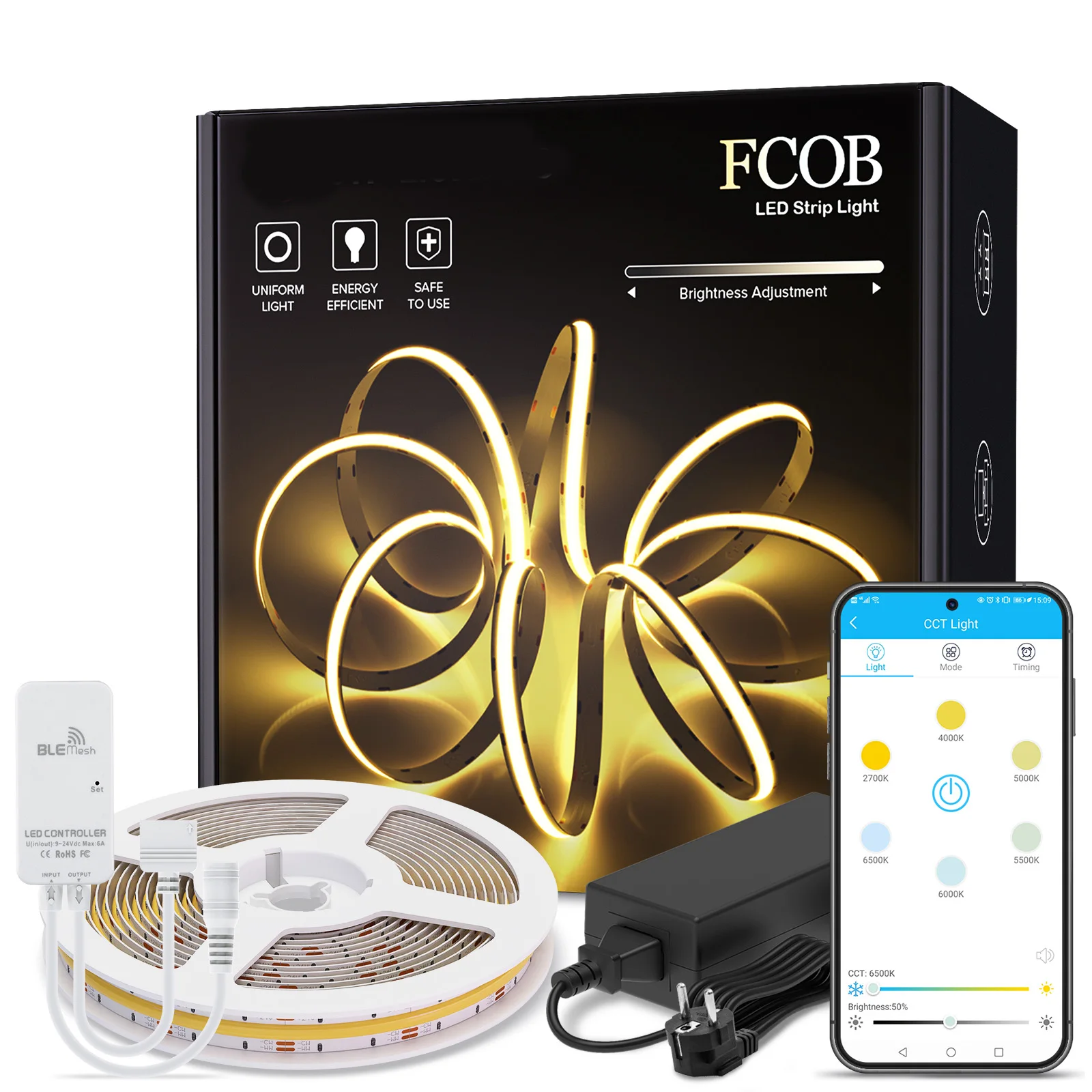 FCOB CCT светодиодный светильник в полоску, комплект, мини Bluetooth приложение, теплый белый с белой регулируемой яркостью, высокая плотность, гибкий COB RA90 светодиодный светильник s DC24V