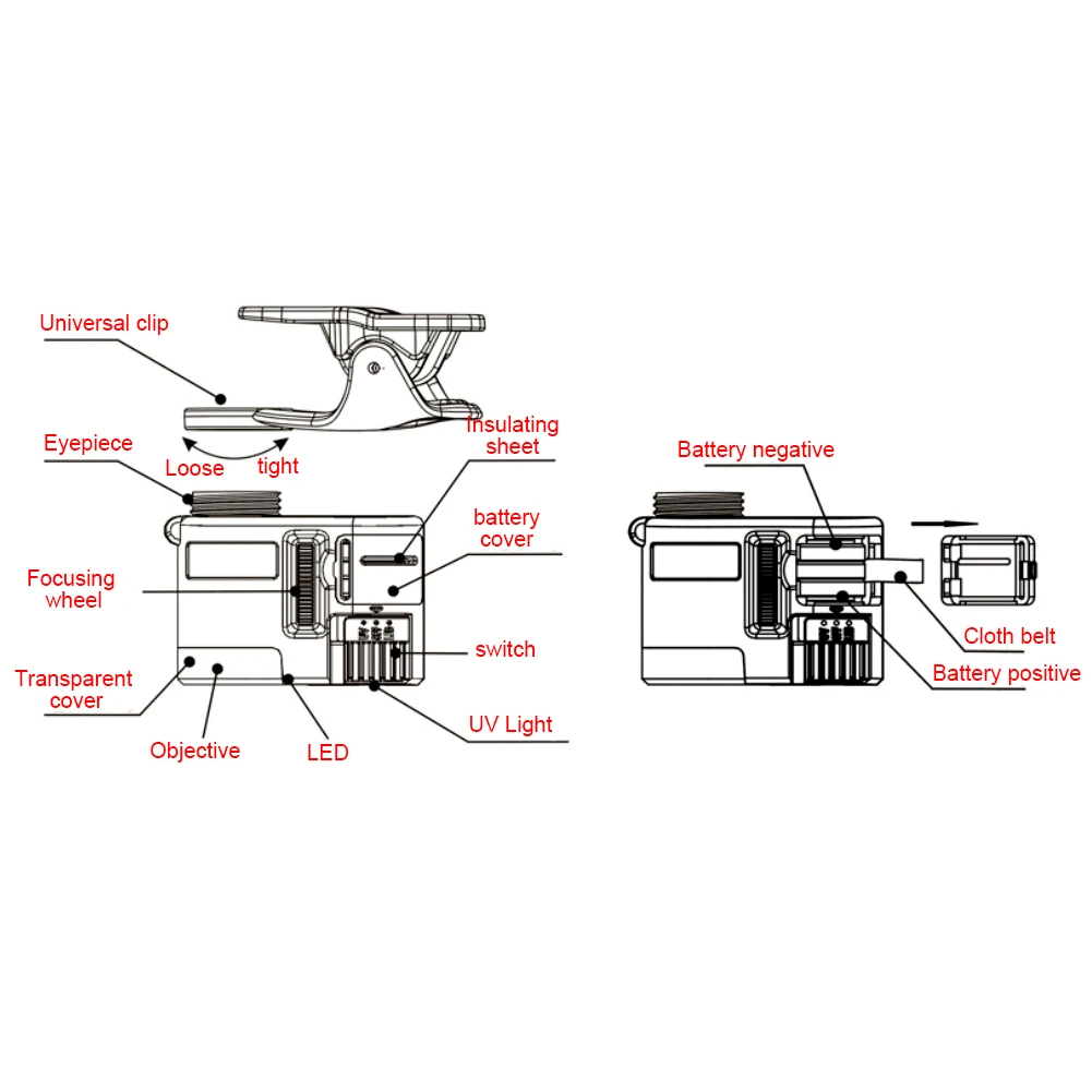 Спецификация: Состояние на 100% абсолютно новый Модель: 9595 Вт Материал: ABS + Акриловые оптические линзы Увеличение: 60x Батарея: 3 * LR1130 кнопочный элемент (не входит в комплект) Светильник: 1 * Светодиодный светильник, 1 * УФ-светильник Вес: прибл. 40 г/1,4 oz Размер: прибл. 58*55*22 мм/2,3*2,2 * 0.9in