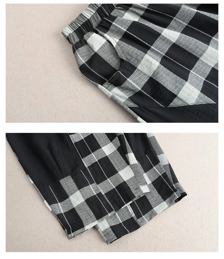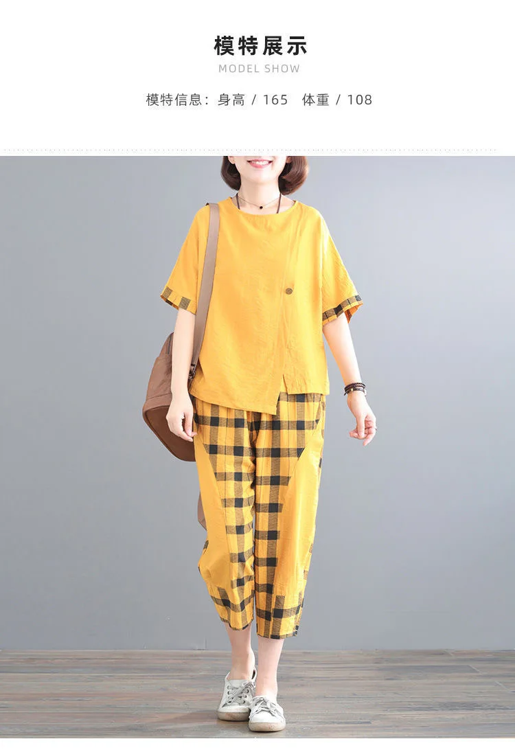 Костюм спортивный женский оверсайз из двух предметов, Повседневная Свободная одежда, футболка с асимметричным подолом и клетчатые брюки, Модный комплект, на лето