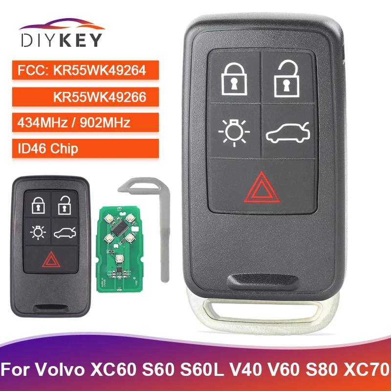 Пульт дистанционного управления DIYKEY с 5 кнопками, 434 МГц, 902 МГц, чип ID46 для Volvo XC60, S60, S60L, V40, V60, S80, XC70, KR55WK49264, KR55WK49266