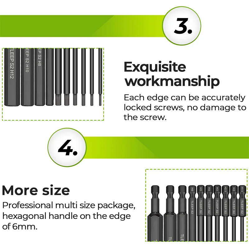 3. 【Профессиональный Набор шестигранных бит изготовлен из легированной стали S2, очень хорошо сделан и прочен, так как твердость может достигать HRC60 градусов. Набор шестигранных ключей подходит для электрических сверл с устройством регулирования скорости, электрических отверток, ручных отверток. Пожалуйста, не используйте сверла на пневматических инструментах, воздушном отверстии и электрической дрели без регулирования скорости. Долгий срок службы сверла достигается благодаря его прочной конструкции и превосходной технологии.
