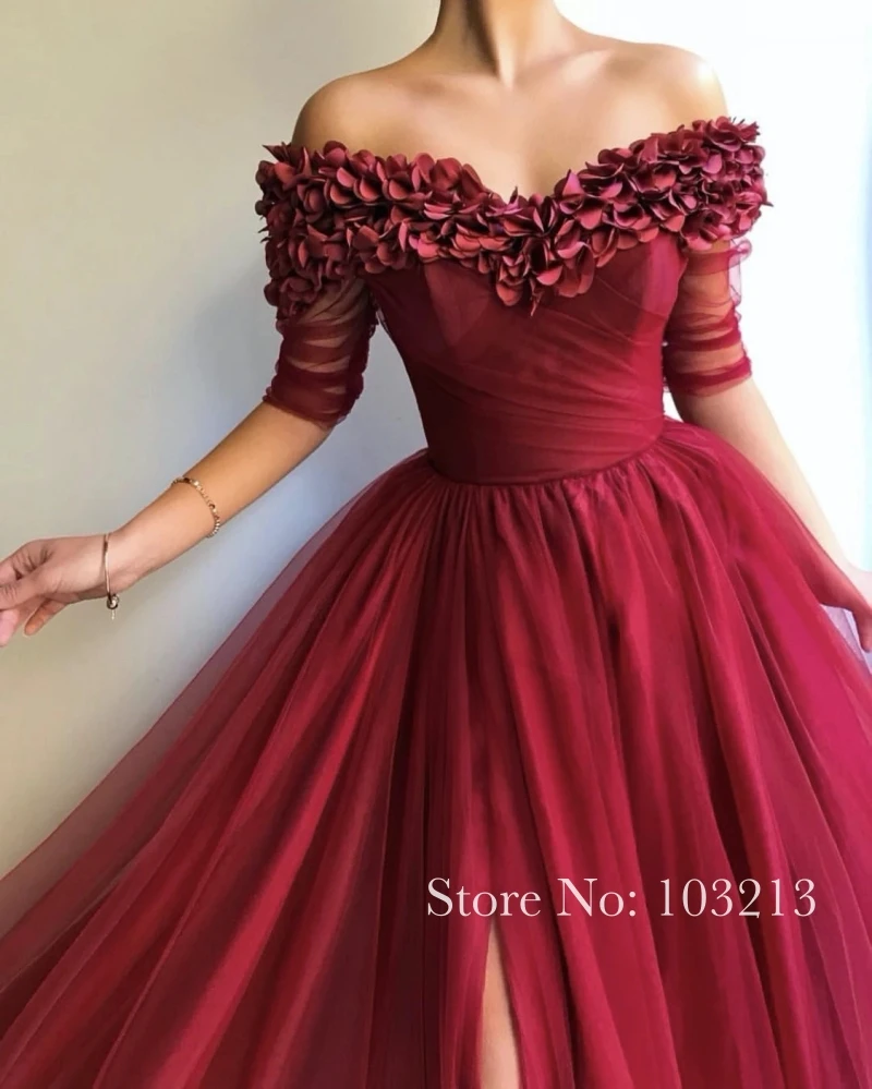 Изысканное бордовое Тюлевое платье для выпускного вечера с открытыми плечами трапециевидного силуэта с цветами ручной работы длиной до пола Вечерние платья из органзы