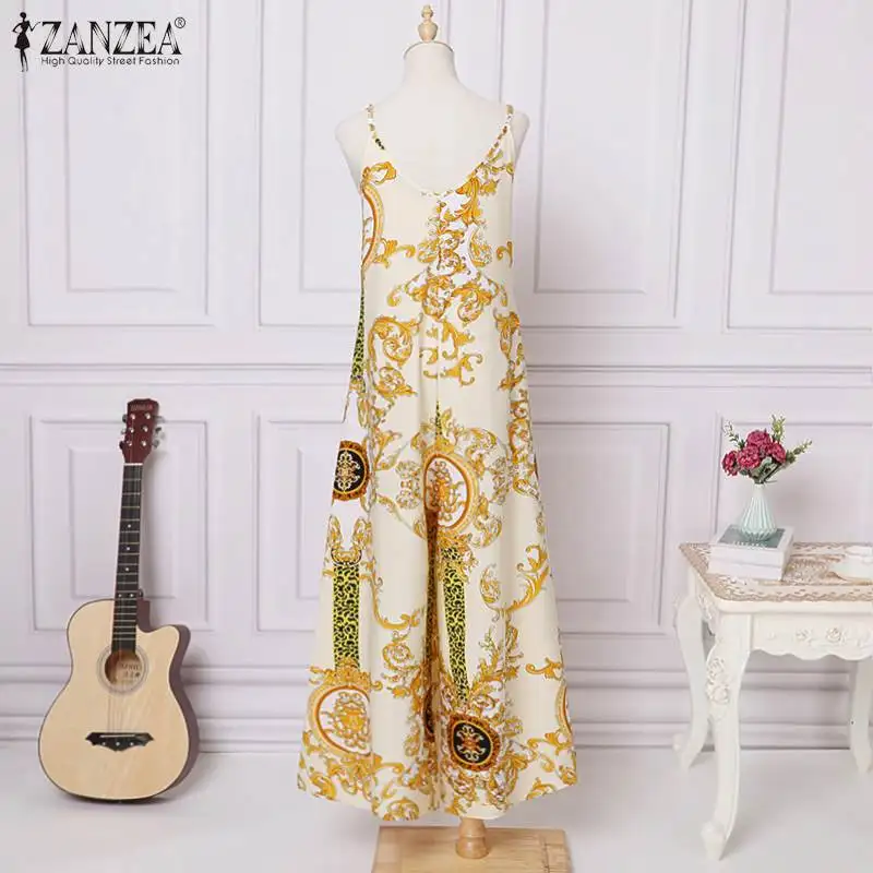 Лето 2021, богемные комбинезоны ZANZEA с цветочным принтом, праздничные пляжные повседневные Комбинезоны без рукавов, женские комбинезоны с широкими штанинами