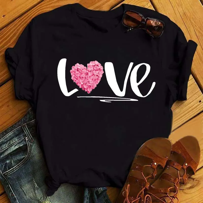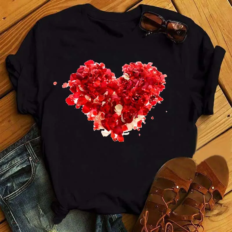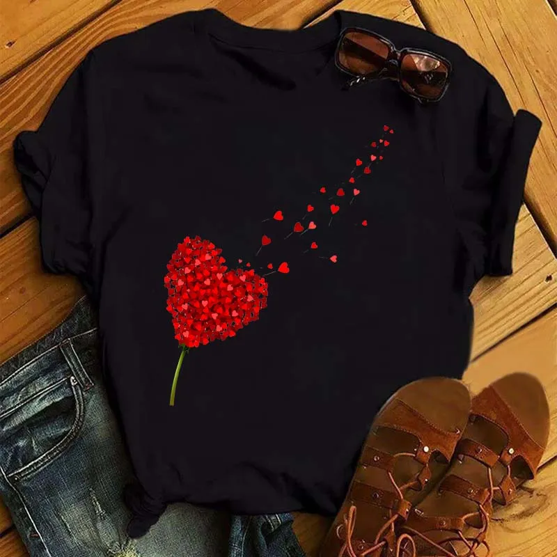 Женская хлопковая Футболка с принтом красных сердечек и роз, повсед...