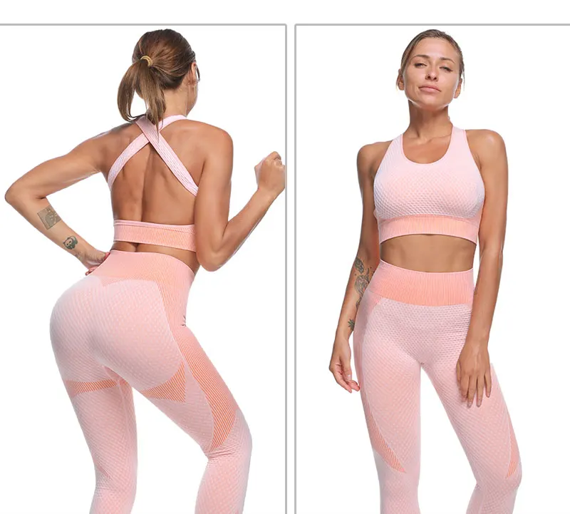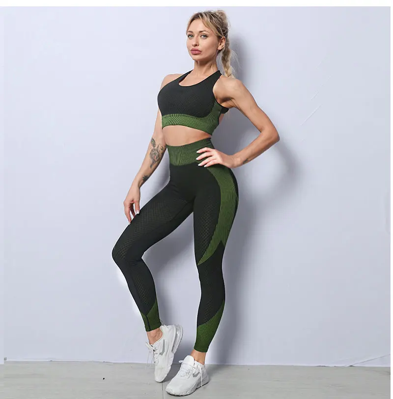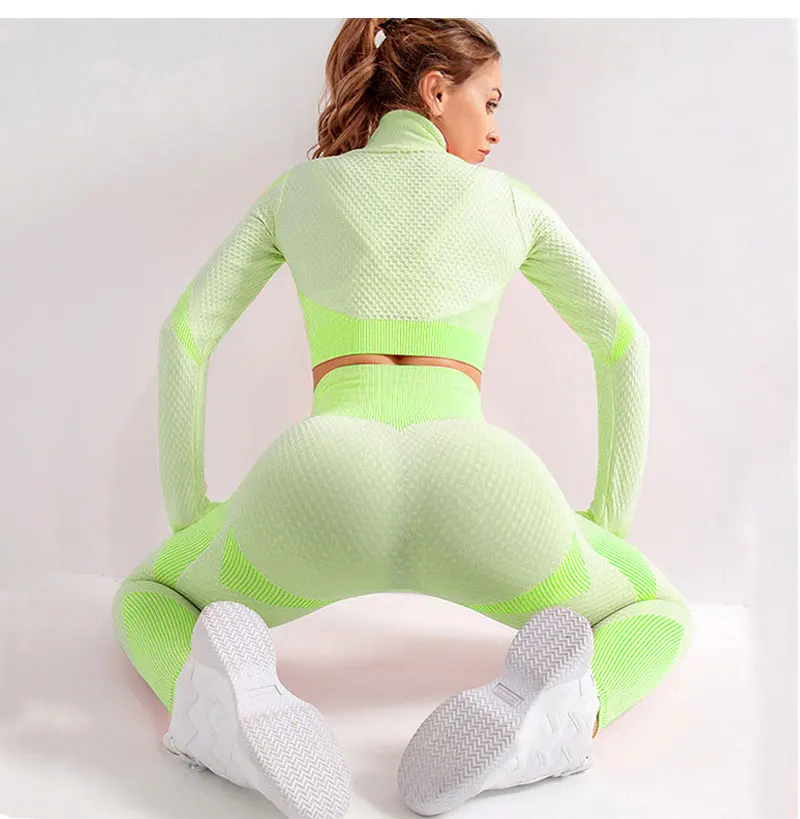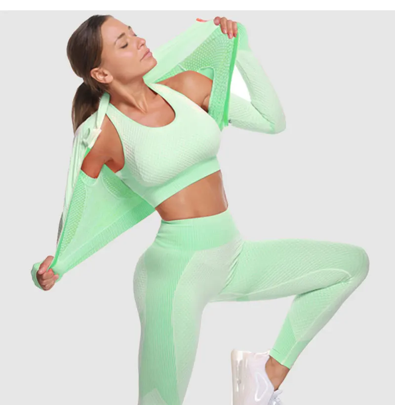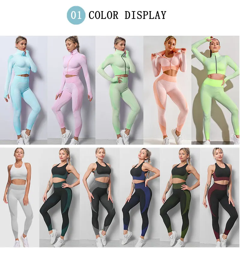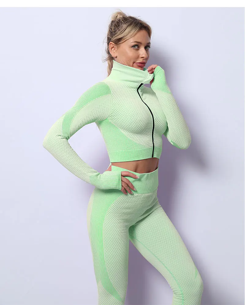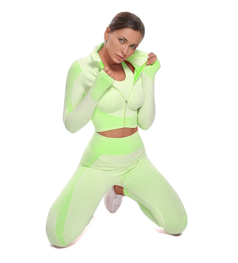 Бесшовные Йога костюм женский спортивный костюм фитнесс Одежда тренажерный зал Комплект Спортивный бюстгальтер с высокой талией леггинсы застежка-молния, спортивная куртка для мальчиков тренировки одежда