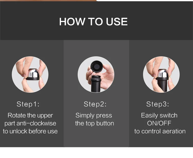 Мини-пробка для шампанского оптимизирует внутреннюю структуру, чтобы сделать пробку более плотной на рот бутылкиНадежно зафиксируйте газ в бутылке, чтобы не допустить медленного рассеивания пузырьков после открытия бутылкиПробка для шампанского имеет дизайн «маленькой крышки», а изогнутый дизайн пухленькой пузырьковой бутылки приклеен, чтобы сделать стиль более гармоничным.Маленький и изысканный, его удобнее хранить.В сочетании с дизайном вращающегося замка, пробка шампанского тщательно добавляется с тремя маленькими желобками, подходящими для живота пальцев, что облегчает вращение и использование