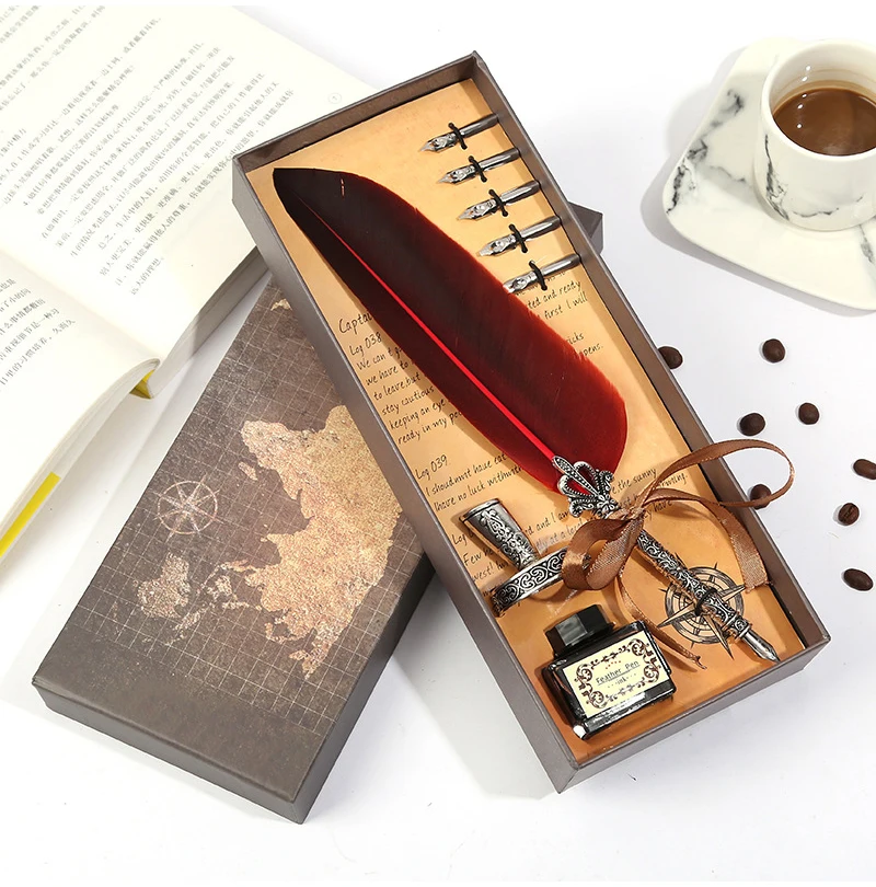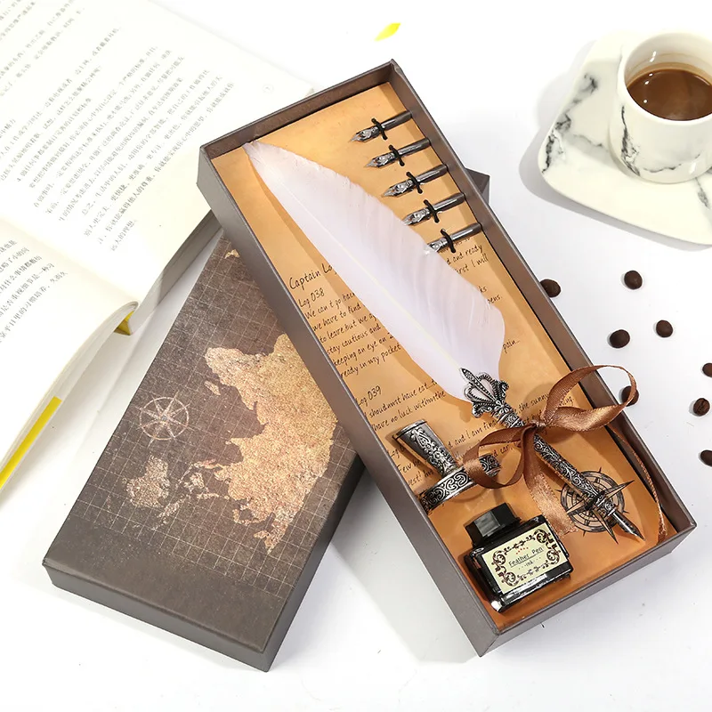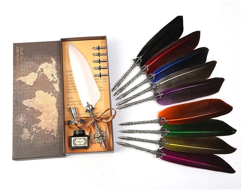 Коробка немного помята, но это не так страшно! Сам набор хороший! Перо металлическое, тяжёлое, удобно держать. ОЧЕНЬ КРАСИВОЕ!!! Всё что было указано ,всё есть в комплекте! Брала в подарок, поэтому пробовать писать не буду.