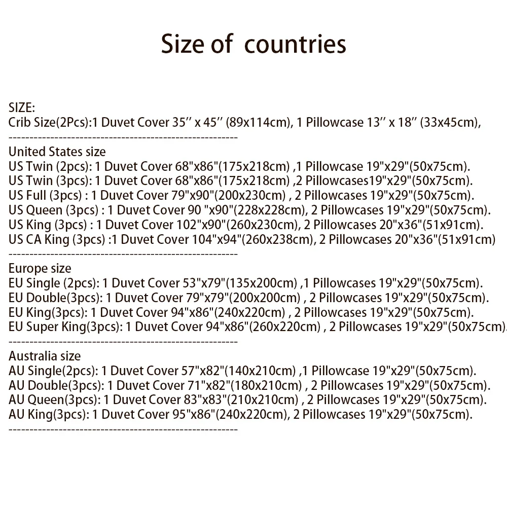 [Что вы получаете] -- : 1 комплект постельного белья и 1 или 2 наволочки (одеяло и простыня в комплект не входят) [Материал]-Мягкая матовая микрофибра обеспечивает максимальный комфорт, благодаря чему обеспечивается глубокий сон каждую ночь. [Застежка-молния и завязки]-скрытая застежка-молния удобно надевать и снимать одеяло. Четыре угловых завязки гарантируют, что Ваше одеяло останется неподвижным в чехле. Размер: Размер кроватки (2 шт.):1 пододеяльник 35 ''x 45'' (89x114 см), 1 Наволочка 13 ''x 18'' (33x45 см), ------------------------------------------------------- Размер США US Twin (2 шт.): 1 пододеяльник 68 "x 86"(175x218 см) ,1 Наволочка 19 "x 29"(50x75 см). US Twin (3 шт.): 1 пододеяльник 68 "x 86"(175x218 см) ,2 наволочки 19 "x 29"(50x75 см). Полный комплект США (3 шт.) : 1 пододеяльник 79 "x 90"(200x230 см) , 2 наволочки 19 "x 29"(50x75 см). Королева США (3 шт.) : 1 пододеяльник 90x90 дюймов (228x228 см), 2 наволочки 19x29 дюймов (50x75 см). Король США (3 шт.) : 1 Пододеяльник 102 "x 90"(260x230 см), 2 наволочки 20 "x 36"(51x91 см). US CA King (3 шт.) :1 пододеяльник 104 "x 94"(260x238 см), 2 наволочки 20 "x 36"(51x91 см) ------------------------------------------------------- Европейский размер EU Single (2 шт.): 1 пододеяльник 53x79 дюймов (135x200 см) ,1 Наволочка 19x29 дюймов (50x75 см). EU Double(3 шт.): 1 пододеяльник 79x79 дюймов (200x200 см) , 2 наволочки 19x29 дюймов (50x75 см). EU King(3 шт.): 1 пододеяльник 94x86 дюймов (240x220 см) , 2 наволочки 19x29 дюймов (50x75 см). EU Super King(3 шт.): 1 пододеяльник 94x86 дюймов (260x220 см) , 2 наволочки 19x29 дюймов (50x75 см). ------------------------------------------------------- Размер Австралии AU Single(2 шт.): 1 пододеяльник 57 "x 82"(140x210 см) ,1 Наволочка 19 "x 29"(50x75 см). AU Double(3 шт.): 1 пододеяльник 71 "x 82"(180x210 см) , 2 наволочки 19 "x 29"(50x75 см). AU Queen(3 шт.): 1 пододеяльник 83 "x 83"(210x210 см) , 2 наволочки 19 "x 29"(50x75 см). AU King(3 шт.): 1 пододеяльник 95 "x 86"(240x220 см), 2 наволочки 19 "x 29"(50x75 см). ------------------------------------------------------- Обратите внимание: 1. Измерение размера продукта допускает погрешность в 1-4 см (0,39-1,57 дюйма). 2. В Комплект пододеяльника не входит одеяло или наполнитель. (Если вам нужен комплект одеял, пожалуйста, проверьте группу магазина «Комплект постельного белья-комплект одеял») 3. Из-за разницы светильник щении и экранах цвет элемента может немного отличаться от изображения. 4. Из-за транспортировки на большие расстояния постельное белье может быть немного помятым, это нормально. 5. Пожалуйста, внимательно ознакомьтесь с описанием товара перед размещением заказа.