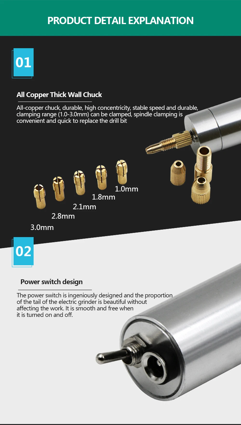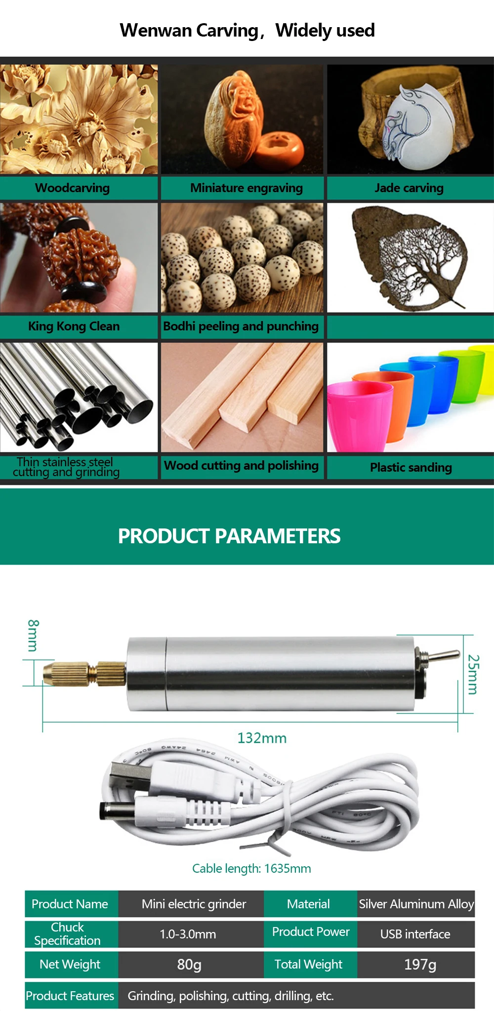 Материал: серебристый алюминиевый сплавТок источника питания: рекомендуется более 2АНапряжение источника питания: 220 ВВходная мощность: 4Скорость холостого хода: 6000Режим переменной скорости: фиксированная скоростьЛиния электропередачи: 1635 ммОригинальный Диапазон зажима: 1,0-1,2 ммОригинальный Диаметр заднего вала: 2 ммХарактеристики продукта: функция/Шлифовка/Резка/СВЕРЛЕНИЕ/пилинг/гравировкаДиапазон использования: дерево/пластик/липа/алмаз/орех/листовое железо/лист