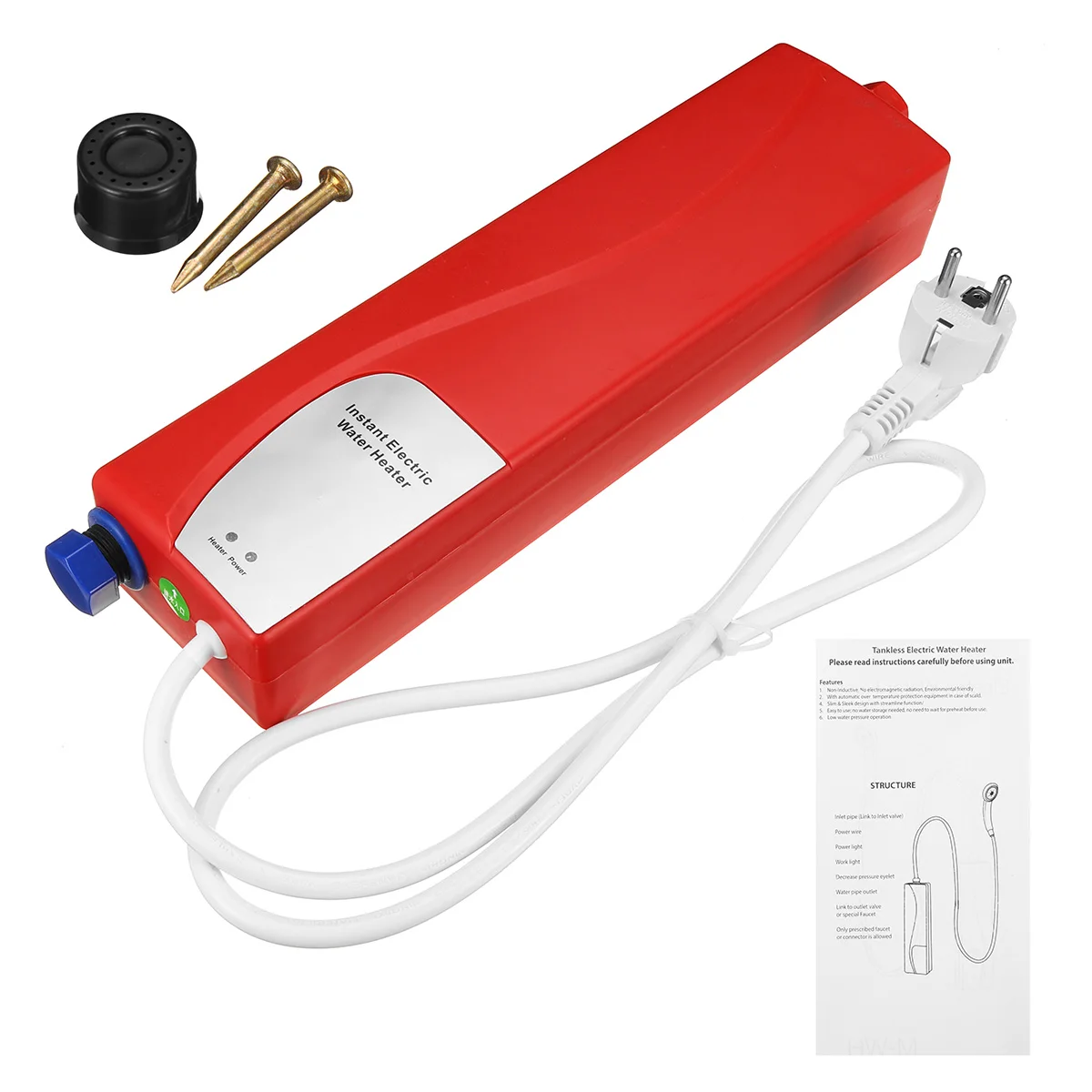 Особенности:Мини-водонагреватель для кухни и ванной комнатыТурбина нагревается неметаллическим нагревом, поэтому вы можете использовать горячую воду по своему усмотрениюЭлектрический водонагреватель без резервуара на выходе 3000 Вт исключает долгое время ожиданияПостоянная температура, поддерживает максимально комфортную для вас температуру водыЭкономит место, легко устанавливается под ванной или кухонной раковиной0 градусов воды в и наружу около 20 градусов, в то время как 15 градусов воды в, он выходит около 30 градусов горячей водыПримечаниеНапряжение данного продукта составляет 220 В.В то время как напряжение США составляет 110 В, не соответствует требованиям.Если вы хотите использовать его в США, ему нужен преобразователь напряжения.Материал: пластикРазмер: 80x50x320 ммНоминальная частота: 50 ГцМощность: 3000 ВтНапряжение: 220 ВШтепсельная Вилка: штепсельная вилка европейского стандартаВодонепроницаемость: IPX4Подходящая водопроводная труба: диаметр 1/2 дюйма (приток или отток)ПосылкаПроточный водонагреватель-1 шт. (шланг и душевая лейка в комплект не входят)1 x сумка посылка вочных аксессуаров