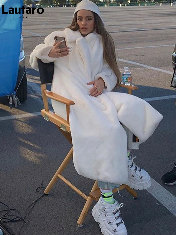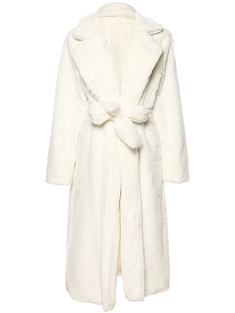 Зимнее длинное белое оверсайз пушистое теплое женское пальто из искусственного меха с капюшоном с отворотом с поясом Свободная корейская мода 2021: верхняя одежда шуба из искусственного экошуба женская