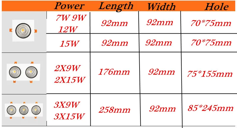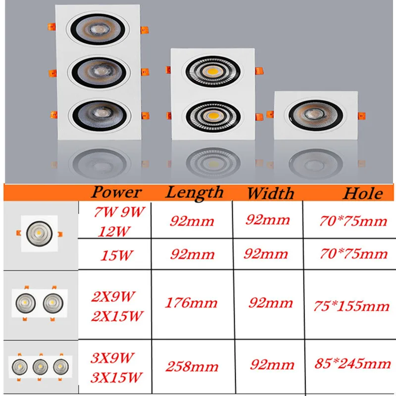 Квадратный Диммируемый светодиодный вниз светильник, 7 Вт, 9 Вт, 12 Вт, 15 Вт, с использованием бескорпусного чипа (220V110V Светодиодный точечный светильник, встраиваемый потолок, Квадратный светодиодный панельный светильник