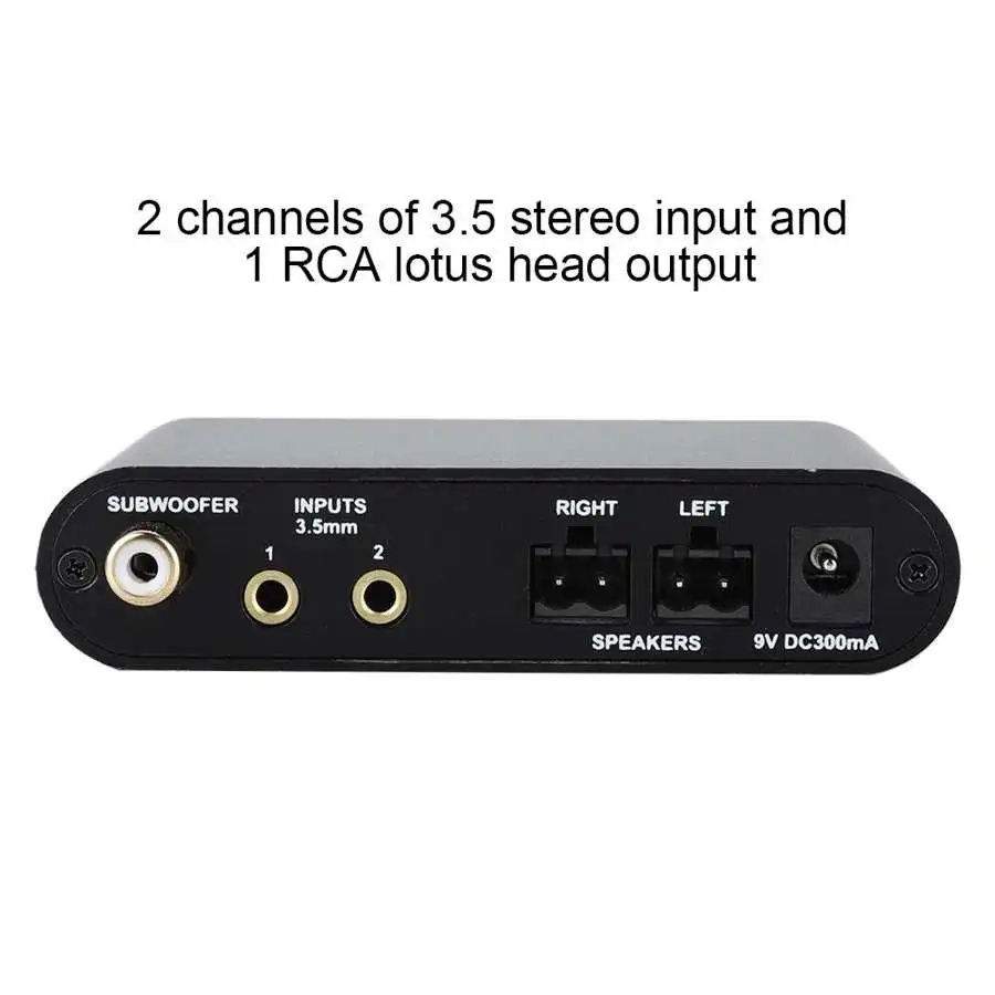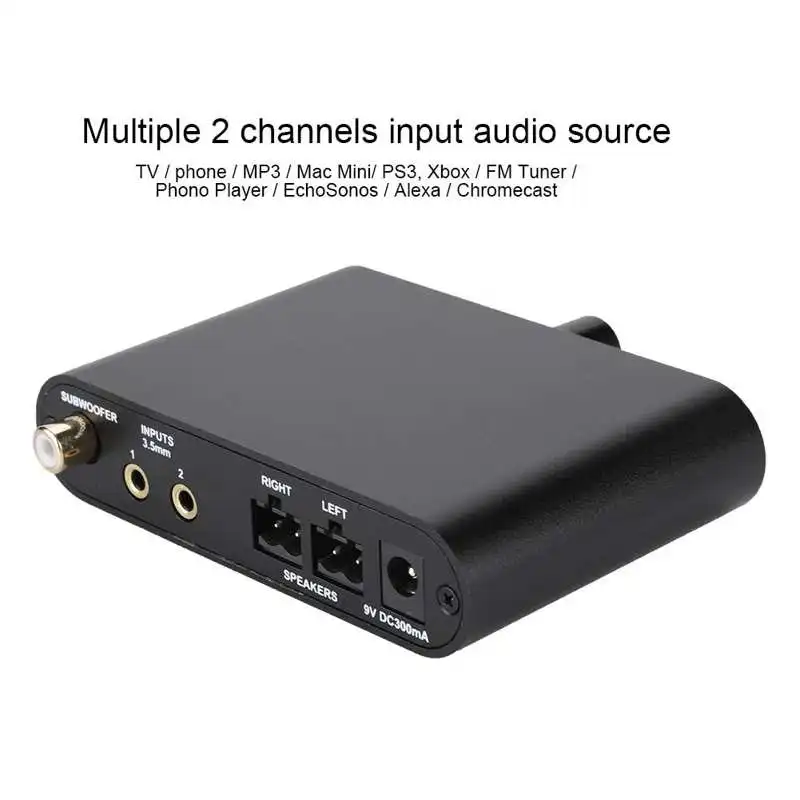 Этот мини-цифровой усилитель имеет 2 канала 3,5 стерео вход и 1 выход голова. Он поддерживает несколько источников звука, для ТВ/телефона/MP3 / Mini / PS3, / FM тюнер/фоноплеер/EchoSonos / Alexa/и т. Д. Он прост в эксплуатации и имеет хороший звуковой эффект.