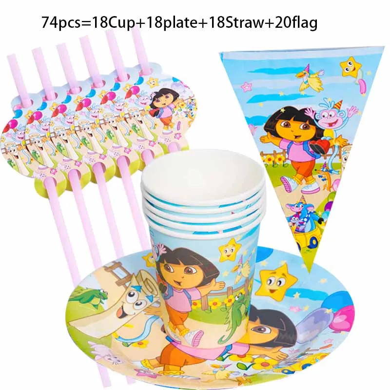 74 шт. принадлежности Дора the Explorer для дня рождения, украшение для вечеринки, одноразовая посуда, салфетка, тарелка, скатерть, баннер