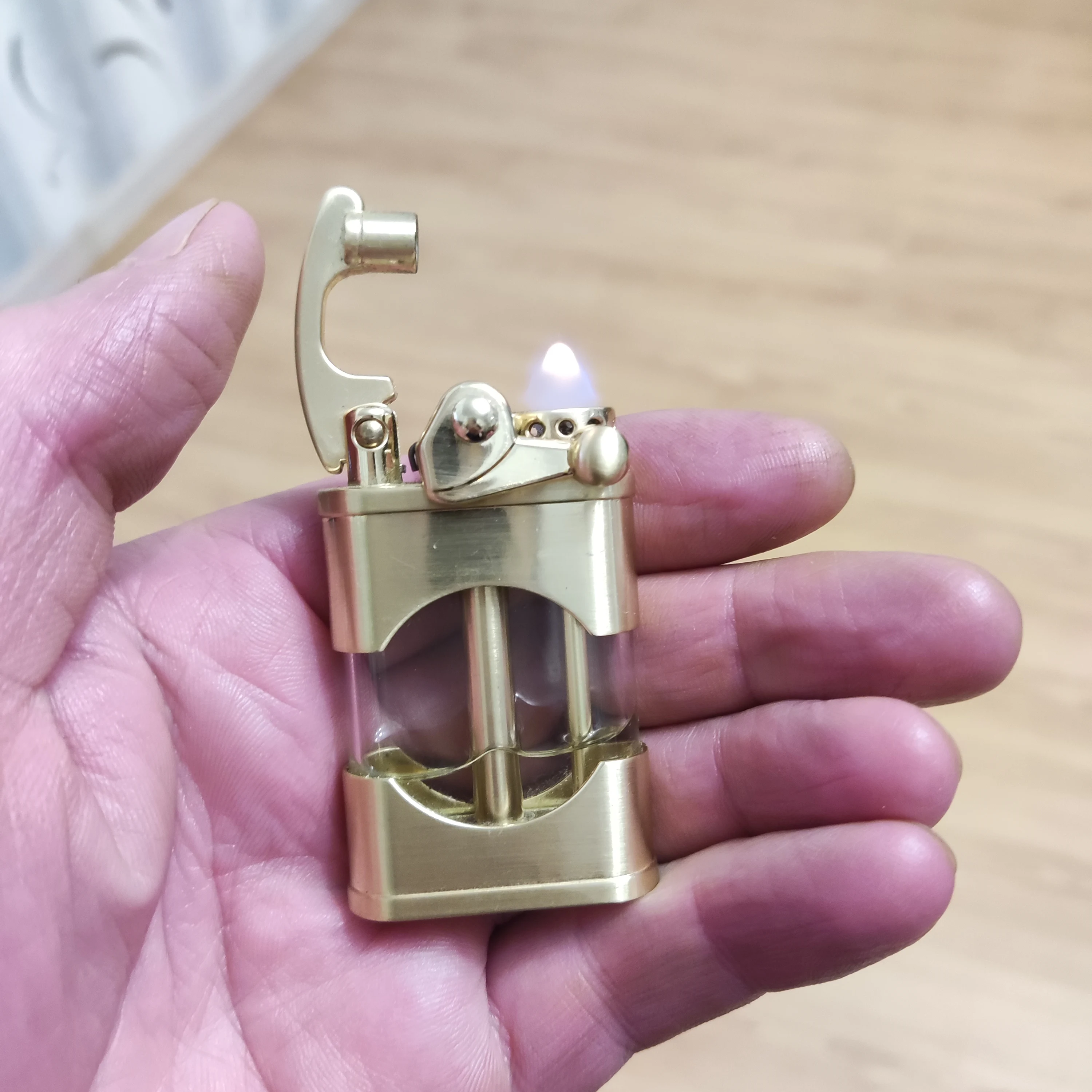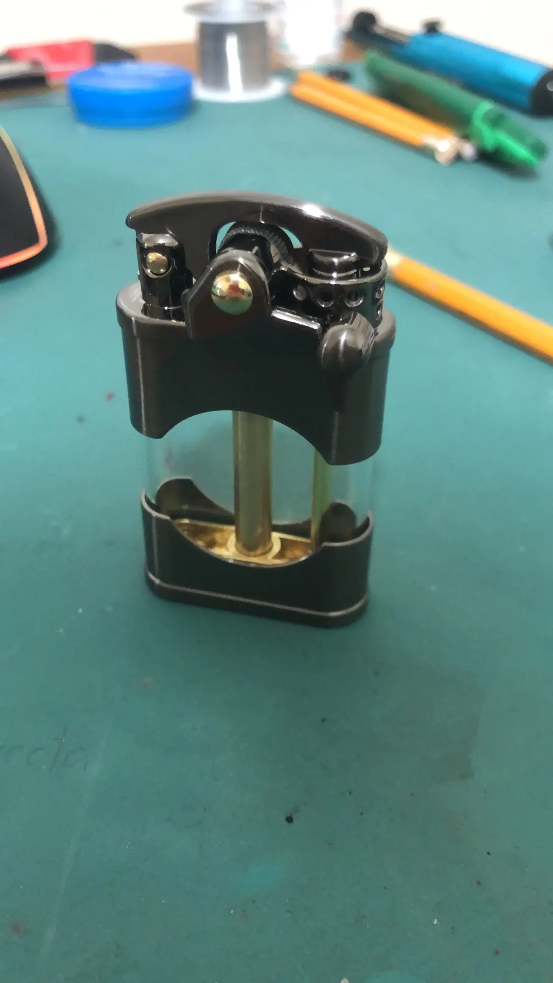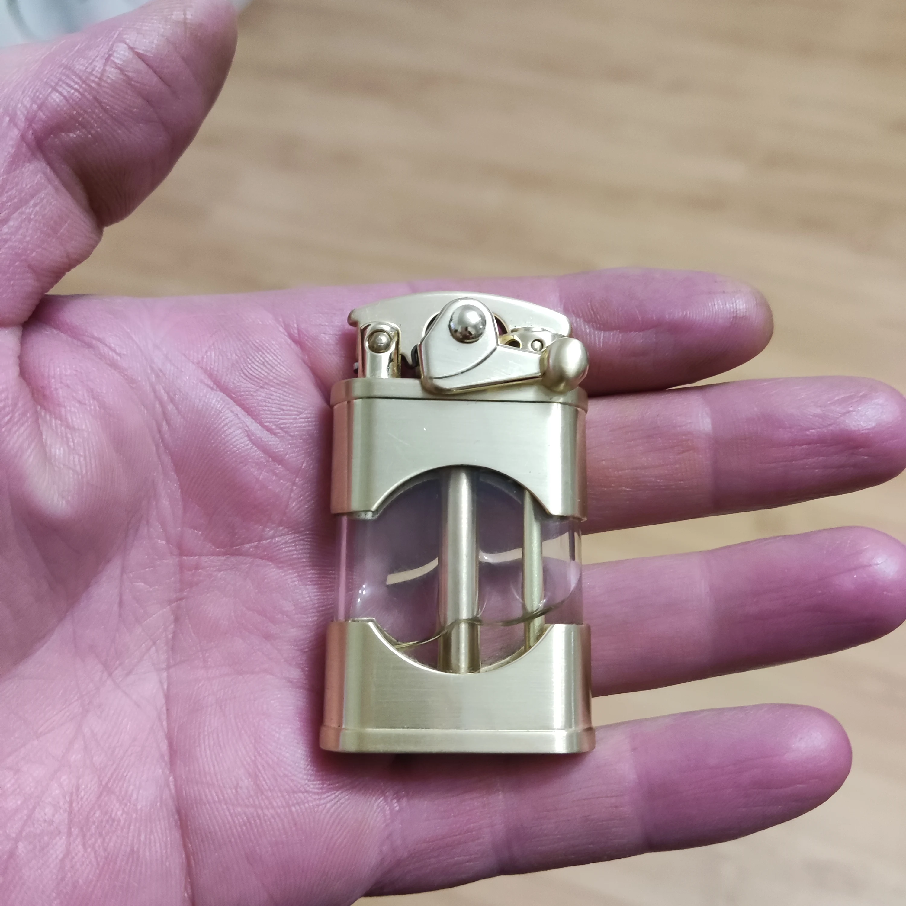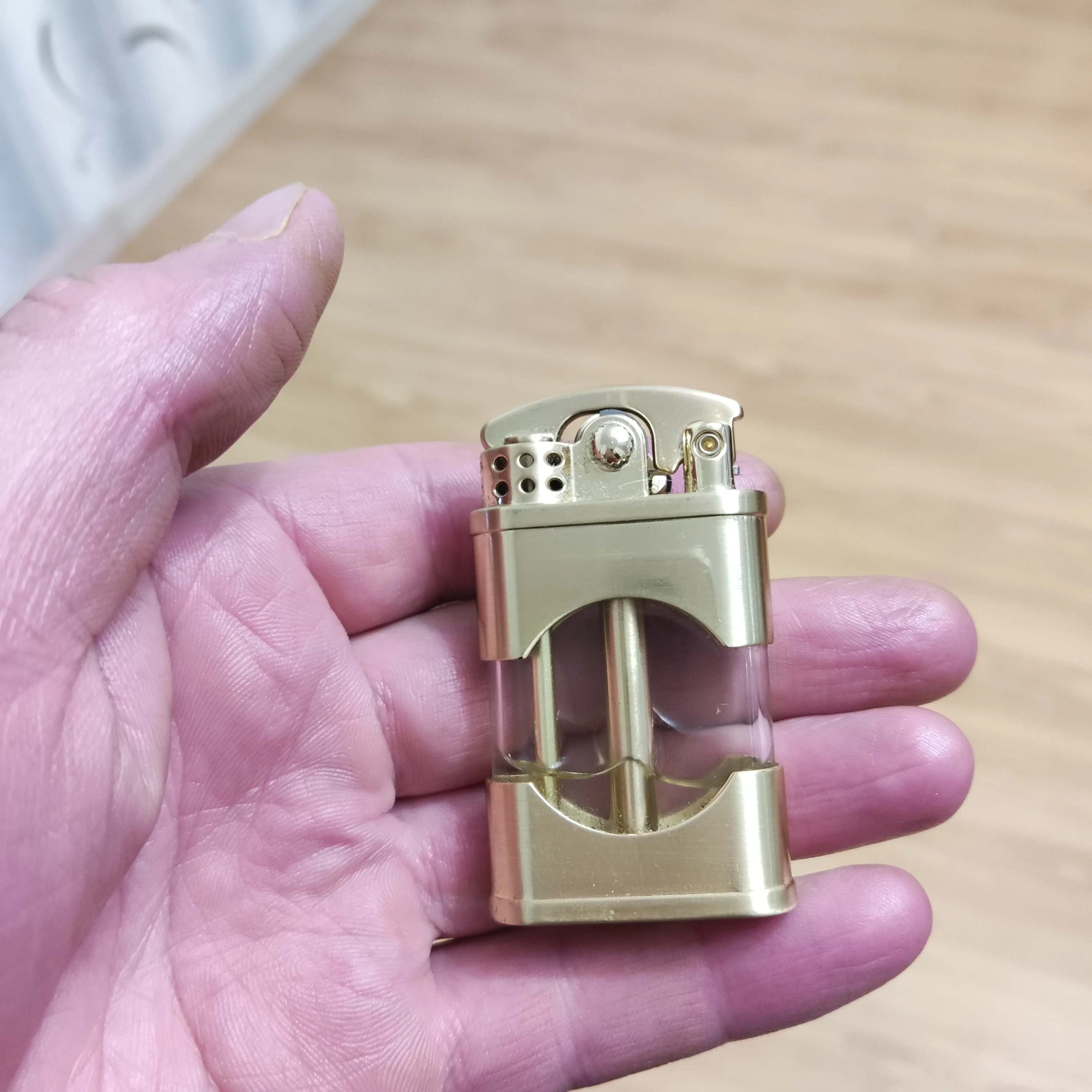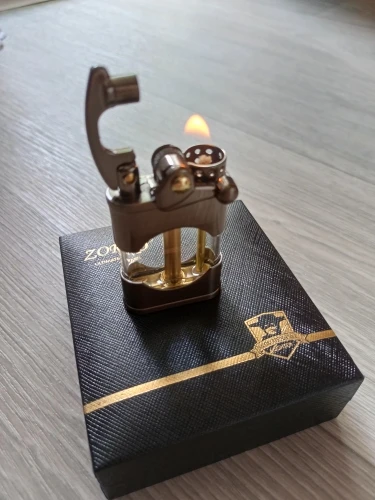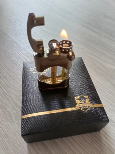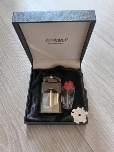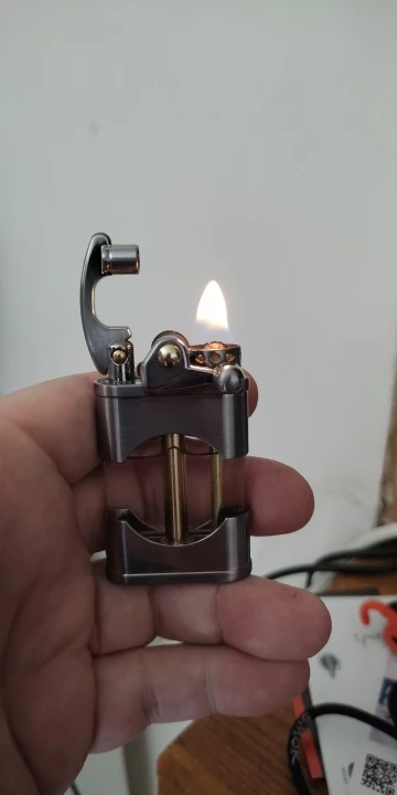 Прикольная зажигалка. Необычная механика, интересно на сколько хватит. Фитиль надо менять - через него быстрое испарение бензина. После замены фитиля бензина хватает на неделю и 6 пачек сигарет плюс побаловаться.