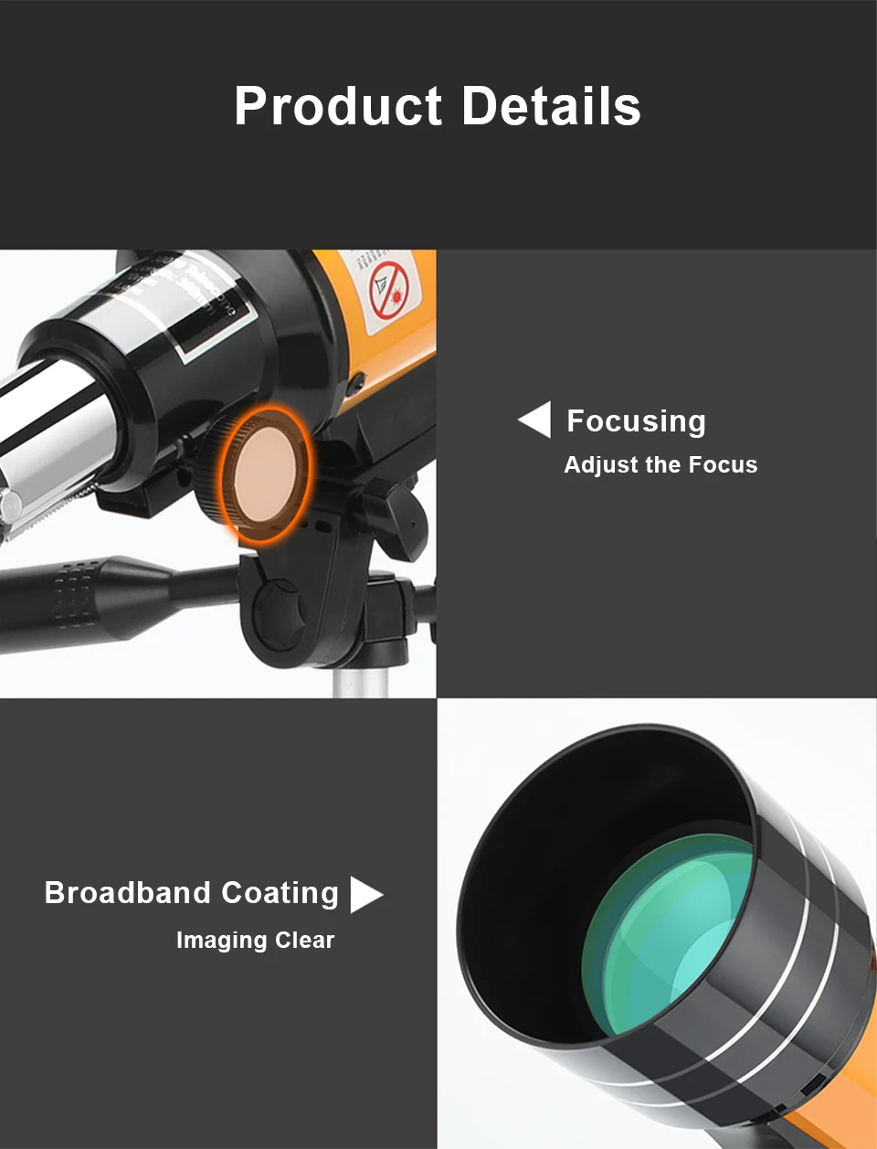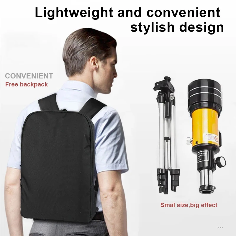 Размер телескопа компактный, и вы можете взять его в любом месте, будь то ночной кемпинг, пешие прогулки или просто роуминг по парку или долгий Драйв ночью и размещение телескопа на машине ночью, чтобы увидеть луну. Вы можете использовать для просмотра диких животных, птиц или звезд. Он поставляется с штативом для стабильности во время использования телескопа.
