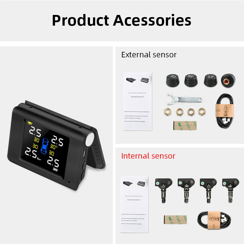 В: что такое TPMS?О: это система контроля давления в шинах, а также датчик давления в шинах. Подайте сигнал тревоги и показывайте давление и температуру автомобиля.В: сколько времени может использоваться сенсорная батарея?A: Встроенный датчик: 5 лет; Внешний датчик: 3 года. Мы предлагаем всем нашим клиентам бесплатную замену батареи, и покупателям нужно всего лишь заплатить около 3-4 $ за стоимость доставки.В: Как установить датчики?О: мы предлагаем установить Встроенные датчики профессиональным автомобильным центром; Внешняя установка может прочитать нашу страницу и руководство для справки.В: работает ли Солнечная зарядка в пасмурный день?О: Да. Как правило, полная Солнечная зарядка может работать в течение 3 дней, и она может работать в пасмурные и туманные дни.В: может ли он работать в снежный день?О: Да. Если TPMS показывает "N5 Alarm", пожалуйста, не волнуйтесь и просто Управляйте автомобилем на расстоянии, чтобы шины двигались. Все будет в порядке. На внешние датчики будет влиять холодная среда, просто нужно управлять автомобилями.В: требуется ли подключение автомобильного прикуривателя для зарядки?О: Нет. Обычно он заряжается от солнечной батареи, но если вы долгое время встречаете очень плохую погоду или вам нужна срочная зарядка, вы можете использовать USB для зарядки. (USB не входит в комплект)В: Нужно ли включать/выключать TPMS?О: Нет. Он включится При ударной загрузке и выключится, если нет удара в течение 10 минут.