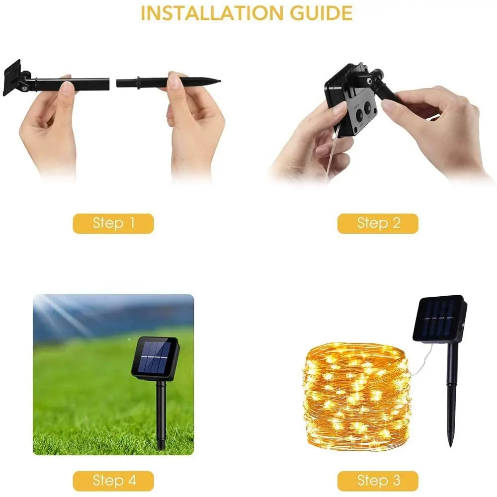 Солнечные струнные светильники на открытом воздухе-это мудрый выбор для освещения внутренних и наружных пространств. Освещение идеально подходит для праздника и романтического настроения.Безопасно для использованияТолько на солнечной энергии, гарантирует, что светильник не будет перегреваться, медный провод этого струнного светильник покрыт эмалью, что делает его хорошо изолированным и безопасным для использования вокруг детей и домашних животных.Легко сделать своими рукамиБлагодаря прочной и гибкой медной проволоке вы можете легко сгибать ее в любой желаемой форме.Водонепроницаемый струнный светильникВодонепроницаемость до IP65, свет может быть защищен от струй воды, что делает его применимым для наружных украшений.Дружественный светодиодный светильникВ то время как солнце садится, эти солнечные мерцающие огни будут появляться как маленькие звезды, чтобы осветить ваше пространство с очаровательной атмосферой.Для использования в помещении и на улицеНе только на открытом воздухе, но и просто оберните вокруг рождественских елок, лестниц, зеркал, кроватей или вещей в каменной банке, фонаре и т. д.8 режимов миганияНажмите кнопку «Mode», чтобы выбрать нужный режим: волны, комбинация, выцветание, светящиеся мухи, погоня, мерцание, медленно выцветание и постоянное включение