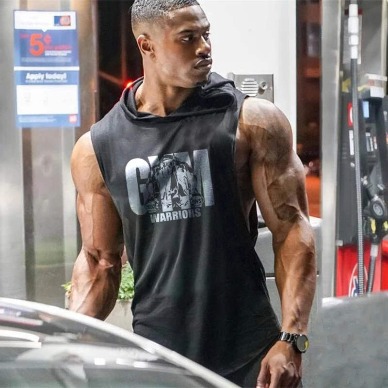 Майка мужская с капюшоном для спортзала, одежда для фитнеса, худи для бодибилдинга, жилет, Спортивная Модная хлопковая футболка без рукавов, лето размера плюс