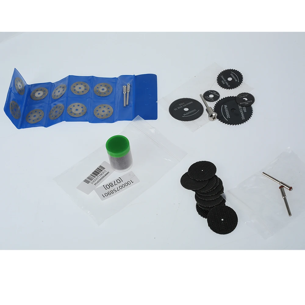 6 шт. x HSS пила для резки древесины10 шт x Алмазное Колесо режущего диска36 шт. x красный резной диск из смолы10 шт. х каучук режущий диск5 шт. x оправка