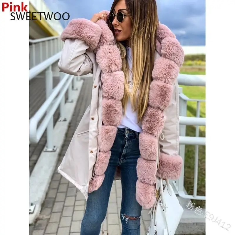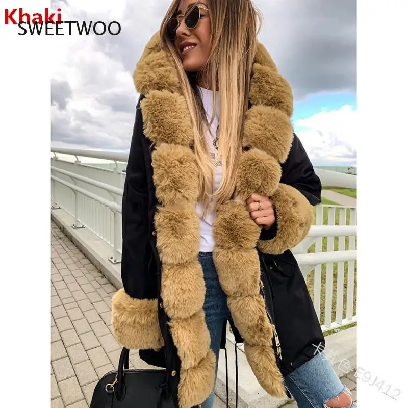 Куртка женская с искусственным мехом, теплая Повседневная однотонная парка с длинным рукавом, верхняя одежда с капюшоном, большие размеры