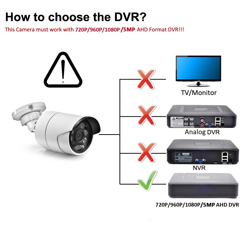 Убедитесь, что у вас есть AHD DVR для AHD камер. Вы не сможете просматривать или записывать без него. Это очень важно! Пожалуйста, не покупайте, если у вас нет AHD DVR!