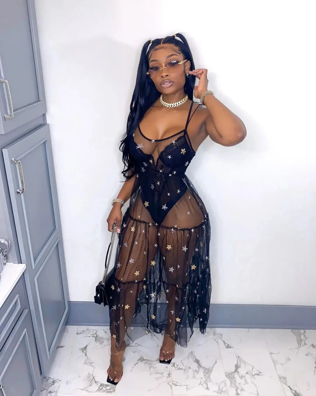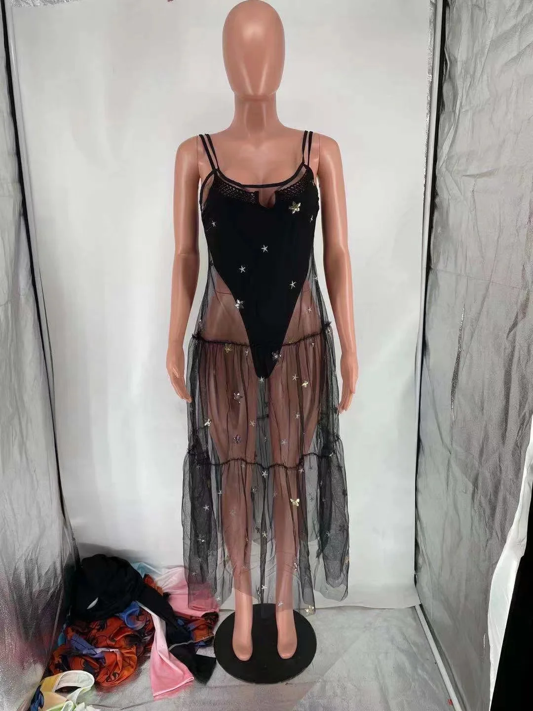 Прозрачное Сетчатое платье-макси на бретелях, с блестками