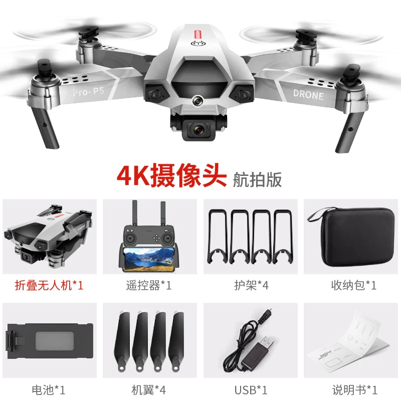 Номер: Дрон P5Количество каналов: 4 каналаГироскоп: 6 осейМотор: бесщеточныйМоторизированная регулировка угла камеры: Фиксированный уголПиксель: 4KУгол обзора камеры: 120 °Конфигурация частота: 2,4 ГГцДистанция дистанционного управления: 150 метров (без помех, без препятствий)Время зарядки: около 80 минутВремя полета: около 15 минутМетод передачи: FPVРежим камеры: пульт дистанционного управления + управление приложениемПерезаряжаемая батарея: 3,7 V 1800mAH литиевая батарея (входит в комплект)Размер квадрокоптера: 28*17*4,5 (см) (не Складная), 4,5*7,5*13 см (складная)Вес квадрокоптера: 400 гФункция: инфракрасная функция предотвращения препятствийОсобенности:На расстоянии 1 метра от препятствия Дрон будет использовать инфракрасный светильник, который он переносит, чтобы избежать препятствий. Это может предотвратить беспилотник от управления полетом во времени и избежать препятствий во время полета.-Складные руки, компактная конструкция, легко носить с собой.-Подключаемое приложение с функцией Wi-Fi, вы можете делать фотографии/видео через камеру телефона и передавать изображения в режиме реального времени. Вы можете получить наиболее реалистичное изображение, чтобы показать нам. Есть отличные видео эффекты в визуальном-Встроенная функция возврата в дом (RTH) может обеспечить более безопасный полет. Когда батарея Низкая или сигнал слабый, Дрон автоматически и точно вернется домой, не беспокоясь о потере дрона.-Оптическое позиционирование потока. Фиксированная высота делает съемку в помещении более легкой и стабильной.-Режим удержания высоты. Установив внешнее давление воздуха, Квадрокоптер может постоянно парить в воздухе, что облегчает съемку.-Фото жестов/видео. Вы будете записывать свою красоту с помощью жестов, сломать старый способ фотографирования и открыть для себя новые вещи (в пределах 3 м)-Самое длинное время полета составляет 15 минут. Большой емкости 3,7 V 1800mAH аккумуляторная батарея может производить до 15 минут времени полета.-Следуй за мной. Независимо от того, куда вы идете, Дрон автоматически отслеживает и захватывает вас. Оставайтесь на фото в любое время, вы можете легко получить сложные фотографии и предоставить функции полета без рук и селфи.-Режим полёта Waypoint. Откройте приложение для дрона, используйте план полета у вас под рукой, просто нарисуйте маршрут на экране, и вертолет будет автоматически летать в соответствии с указанным путем.-Объемный звук с фиксированной точкой. Выберите точку, и Дрон полетит вокруг этой точки.-Шестиосевой гироскоп, полет более стабильный и простой в управлении.-Фюзеляж quadcopter изготовлен из высокопрочного инженерный пластик, который является светильник в весе и прочный.Посылка включает в себя:1 самолет1 пульт дистанционного управления1 x авиационная батарея4 запасных пропеллера2xusb зарядный кабель1 отвертка1 х Руководство